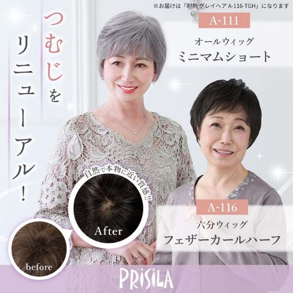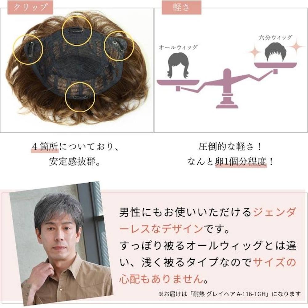 プリシラ ミセス六分ウィッグ フェザーカールハーフ 耐熱 グレイヘア A-116-TGH 頭頂部を覆って広範囲をカバーする六分ウィッグ ※モニターの設定や機種、撮影の関係上実際とは色味が若干異なる場合がございます。予めご了承ください。 ※フルウィッグではありません。 【返品・交換について】 以下の場合は返品・交換をお受けできません。 1.お客様の不注意により破損、不足、汚損した場合 2.お客様都合の場合(例:注文間違い。色、デザインが気に入らない。また思っていたものと違う場合など。) 3.上記「返品・交換対象」に該当するものであっても商品到着後8日以内にご連絡がなかった場合、また一度でも使用された場合 ※商品が届いたらすぐに内容をご確認ください。ウィッグは直接肌に着けるものであるため、開封・未開封に関わらず不良品以外の返品・交換はお受けしておりません。 (お求めの際はよくご確認の上ご購入をお願い致します)