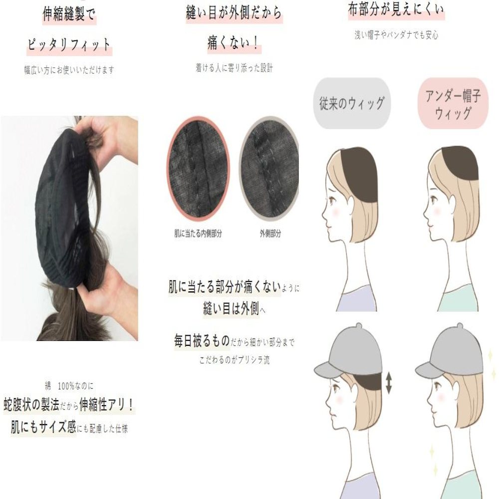 プリシラ アンダー帽子ウィッグ ショートボブウィッグ 耐熱ウィッグ 部分ウィッグ インナー型ウィッグ 前髪ウィッグ 通気性抜群 ショコラブラック 帽子ウィッグ