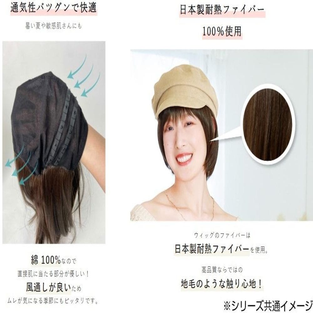 プリシラ アンダー帽子ウィッグ ニュアンスショートボブ 耐熱 ショコラブラック BO-20-TCK ゆるめカールのショートボブ! アンダー型の帽子ウィッグ!コットン100%キャップの縁周りに耐熱ファイバーを縫製しています。全頭にファイバーを縫製していないインナー型タイプなので、帽子やターバンの下に着けることができ、通気性抜群でや肌触りも柔らか。前髪はスナップボタンで取り外し可能です。取り付け位置は2段階あり長さ調節が可能です。 【ウィッグのタイプ】 インナー型の帽子ウィッグ ※フルウィッグではありません 頭の上半分程度はファイバー縫製無し・キャップのみ 帽子やターバンに合わせて着けるタイプのインナー型ウィッグ 前髪は取り外し可能(スナップボタン)/取り付け位置は2段階 【ファイバー】 人毛のような自然さのファイバーを使用。 国内メーカー製耐熱ファイバー100% ※自毛をまとめるオールウィッグネットは付属していません。