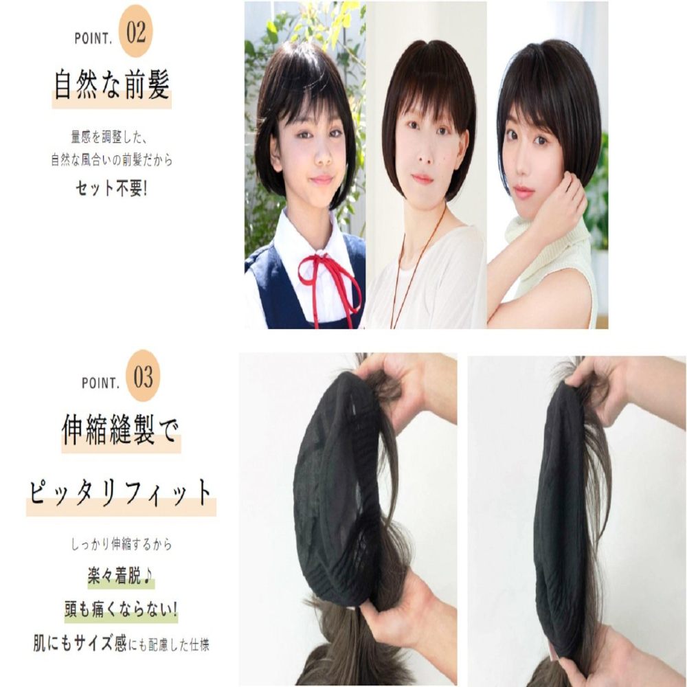 プリシラ 帽子ウィッグフィットショートボブ耐熱 ダークブラウン BO-11-TDB ちょっぴり前下がりのおしゃれショートボブ 頭囲の小さなお子さまや、抗がん剤治療に伴う脱毛や抜毛症等で髪の毛が減り、既存のウィッグサイズでは「大きい」と感じられる方の医療用目的としてもご使用いただけます。内側は柔らかい素材の帽子になっているので、長時間の着用にも向いています。帽子感覚で使用でき、頭にしっかりフィットするのでお出かけにもおススメです。 人工スキン:有 アジャスタ有(面ファスナータイプ) ■ウィッグの付け方 (1)内側の帽子をもち、ウィッグをかぶります。 (2)ウィッグを自分のこめかみやつむじの位置と合わせます。 (3)ブラシや手グシで整えたら完成です。 ※自毛をまとめるオールウィッグネットは付属していません。 必要な場合は別売りのネットをご購入ください。 ■ご注意ください。 ※撮影状況やお使いのモニター環境などにより、実際のカラーと異なって見える場合がございます。