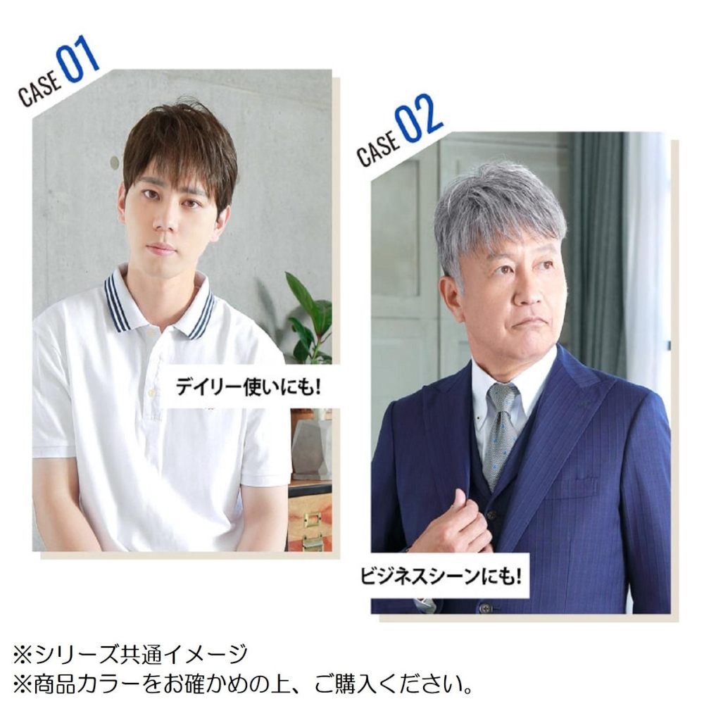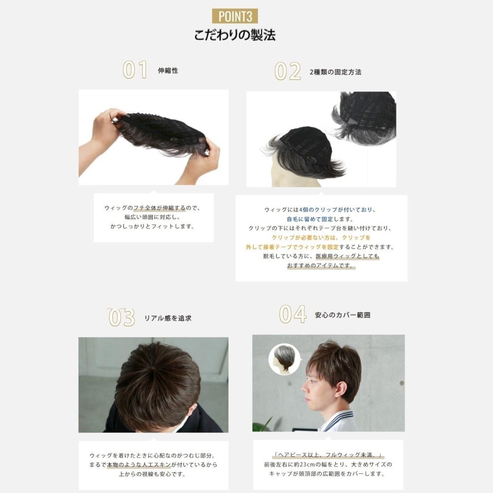 プリシラ 男性用5分ウィッグ ボリュームショート 耐熱 ダークグレイヘア GB-23-TDGH 毛足が長く立ち上げやすいショートスタイル クリップの下にはテープ台を縫い付けているので、クリップを取り外し、医療用テープをテープ台に貼り、頭皮に直接貼り付けることができます。 ※ウィッグ専用医療用両面テープは別売りです。 ■ウィッグのタイプ 五分ウィッグ(部分ウィッグ) ※フルウィッグではありません※ 自毛をいかして広範囲をカバーする部分ウィッグ。 クリップで固定するタイプのウィッグです。 医療用テープ台付き 人工スキン:有り クリップ4個付 テープ台4箇所 ■ウィッグの付け方 (1)4箇所のクリップを開いた状態にします。 (2)ウィッグを頭に乗せ、すぺてのクリップを留めて固定します。 (3)ウィッグがずれないよう軽く押さえながら自毛となじませてブラッシングします。 (4)指でつまむようにトップを立ち上げてふんわりとセットしたら完成です。 ■ご注意ください。 ※撮影状況やお使いのモニター環境などにより、実際のカラーと異なって見える場合がございます。