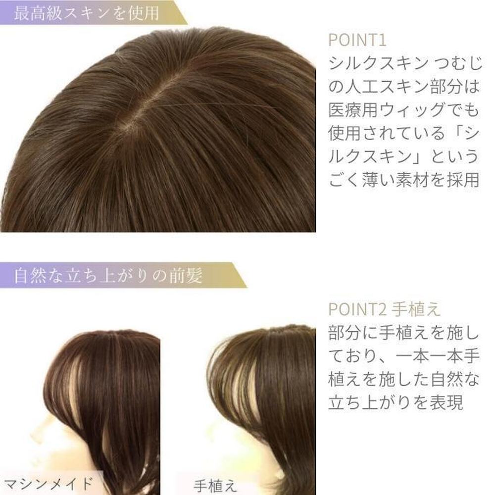素材・材質:耐熱ファイバー100% 仕様:ウィッグのタイプ(【部分手植え】耐熱白髪隠しウィッグ、頭頂部などのカバーに最適な部分かつら※前髪生え際ネット部分のみ手植え)、人工スキン有※シルクスキン採用、クリップ3個付き(前側:黒2個、後側:茶1個)