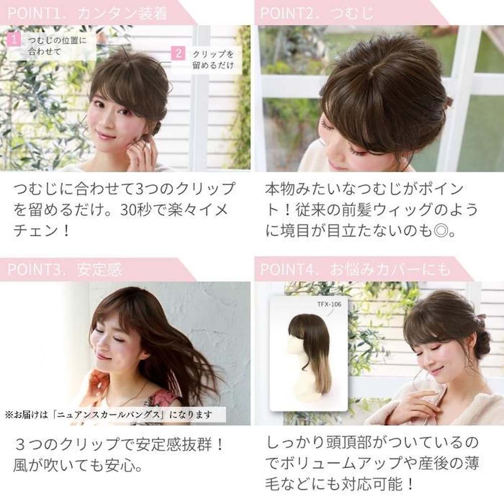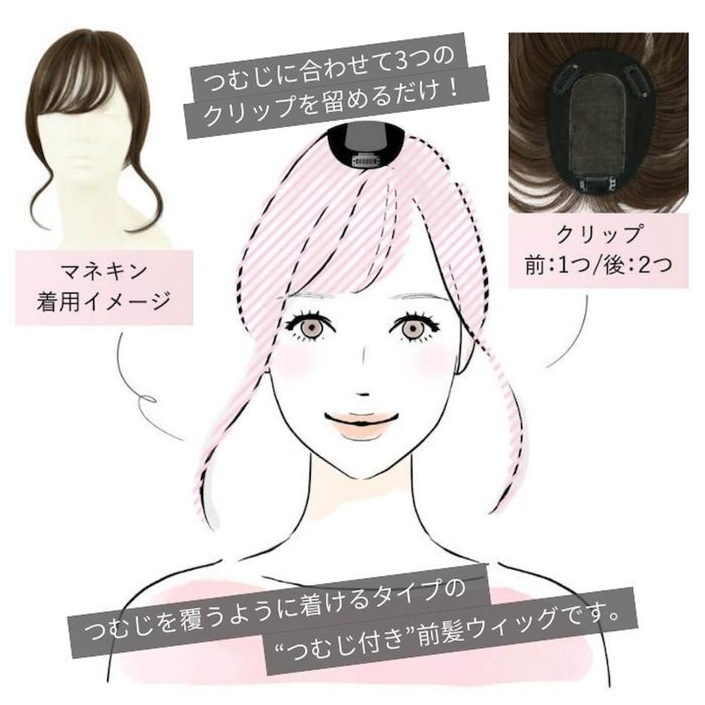 素材・材質:耐熱ファイバー100% 仕様:ウィッグのタイプ(マシンメイド前髪ウィッグ(つむじ有り)、自毛の前髪を両サイドに分けた上に着けるタイプの部分ウィッグ)、人工スキン有、クリップ3個付き(前側:1個、後側:2個)