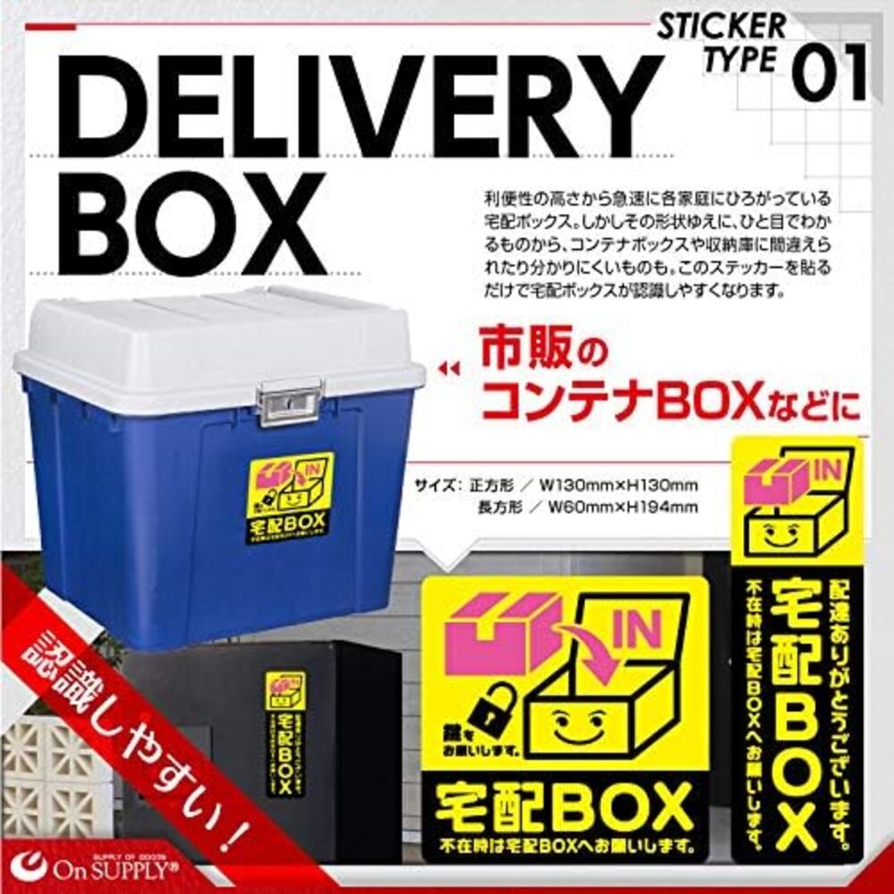 ●ステッカーの利点・効果 1)低コストでだれでも貼れる簡単シール 2)手軽に市販のコンテナでも宅配ボックスになります。 3)配達員への視認性が高く、誘導に効果があります。