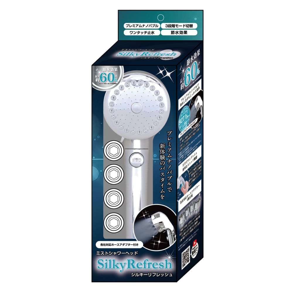 プレミアムナノバブルでしっかり汚れを落とす。節水効果最大60%プレミアムナノバブルで新体験のバスタイムを。洗浄力と肌へのやさしさを兼ね備えた一本です。ミストモード・マルチモード・シャワーモードの3段階モードはヘッドを回すだけの簡単操作。手元止水機能付きでワンタッチ止水。【仕様】[最高使用温度]約60度[付属品]取り付けアダプタ4種
