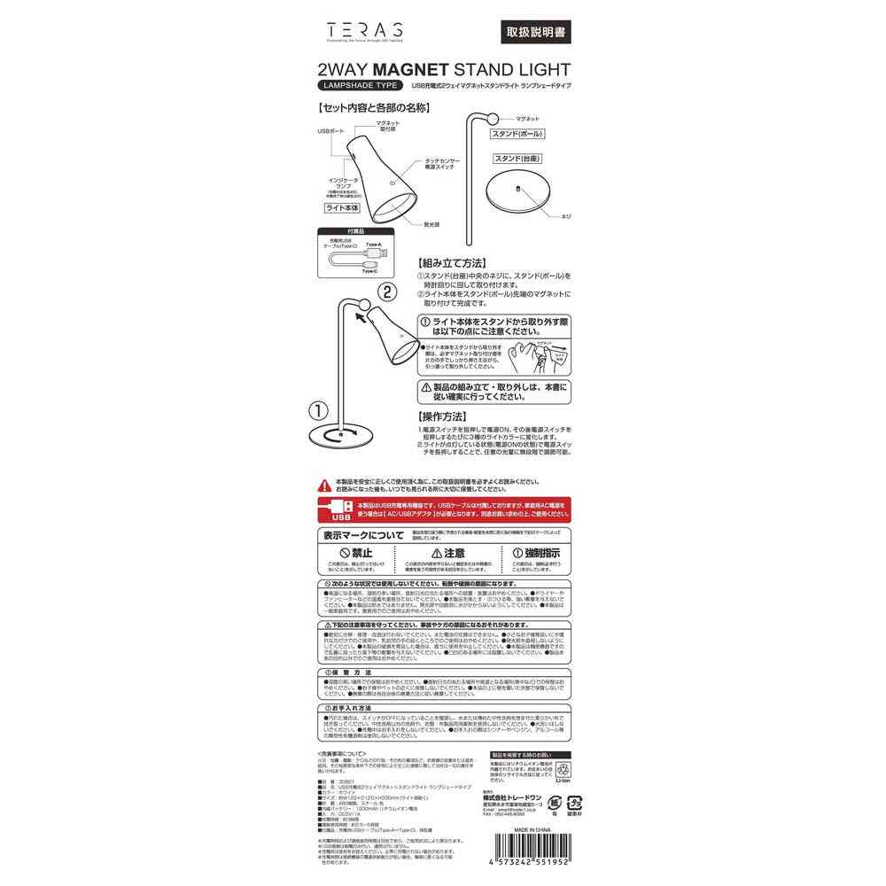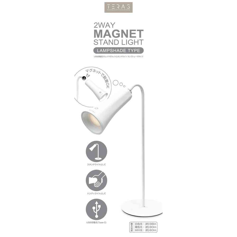 ハンディライトとしても使えるマグネットスタンドライトです。 電源スイッチを長押しすることで、光量を無段階で調節することが可能です。電源スイッチを押すたびに、3種のライトカラーに変化します。(WHITE/WHITE WARM MIX/WARM)光量調節機能と合わせてお好みの照射が可能です。ライト部は充電式なので停電時や非常時などの常備灯としても使用可能です。ライト部はマグネットで固定されており、取り外してハンディライトとして使用可能です。 USB Type-Cコネクタによる高速充電式。コードレスで使用可能なので屋内だけでなく、キャンプや車内などでもご使用いただけます。 ライト部はマグネットを基点に自由な角度で固定可能。光量調節機能と合わせて、お好みの照射が可能です。 【仕様】内蔵バッテリー:1200mAh リチウムイオン電池 ●入力:DC5V/1A ●充電時間:約3時間 ●連続使用時間:約2.5~5時間 ●付属品:充電用USBケーブル(Type-A・Type-C)、保証書