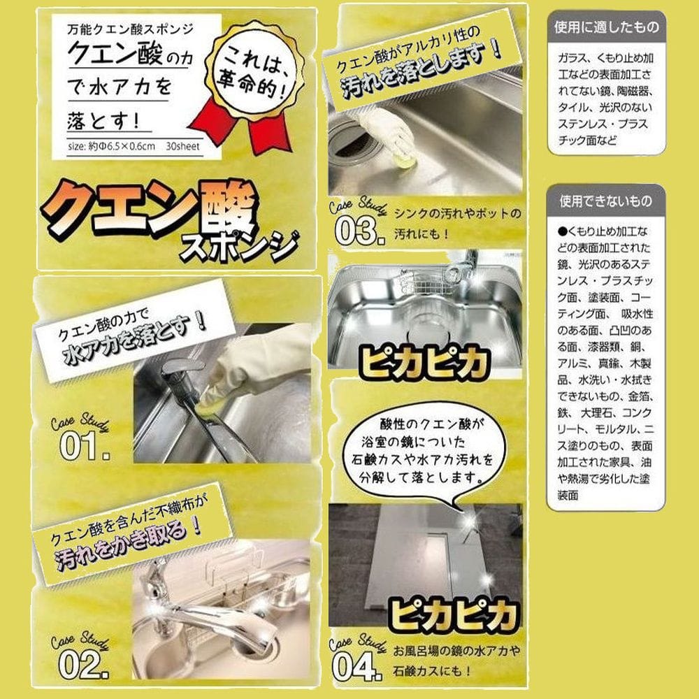 クエン酸の力で水アカを落とす!毎日使っても30枚!使い切りで便利です。万能クエン酸スポンジのクエン酸の力で水アカや石鹸カスなどアルカリ性の汚れに効果を発揮します。使い方は簡単!スポンジを水につけて擦るだけ。※水をつけ過ぎないでください。クエン酸成分が流れ落ちてしまいますので、ご注意ください。シンクの汚れやポットの汚れにも使えます。使い捨てタイプだからいつでも清潔で衛生的です。【仕様】耐熱温度:約60℃●セット内容:30枚●使用に適したもの:ガラス、くもり止め加工などの表面加工のされていない鏡、陶磁器、タイル、光沢のないステンレス、プラスチック面など●使用できなもの:くもり止め加工など表面加工された鏡、光沢のあるステンレス・プラスチック面、塗装面、コーティング面、吸水性のある面、凹凸のある面、漆器類、鍋、アルミ、真鍮、木製品、水洗い・水拭きできないもの、金箔、鉄、大理石、コンクリート、モルタル、ニス塗のもの、表面加工された家具、油や熱湯で劣化した塗装面●液性:酸性タイプ※塩素系の製品と一緒に使う(まぜる)と有毒な塩素ガスが出て危険