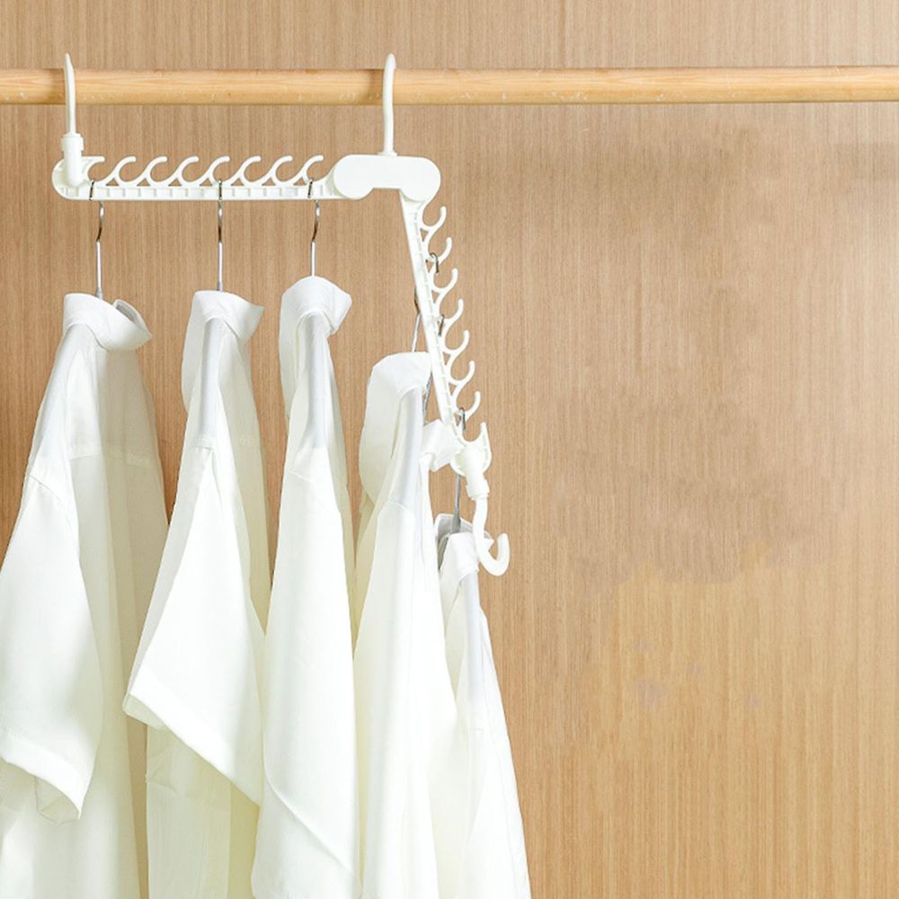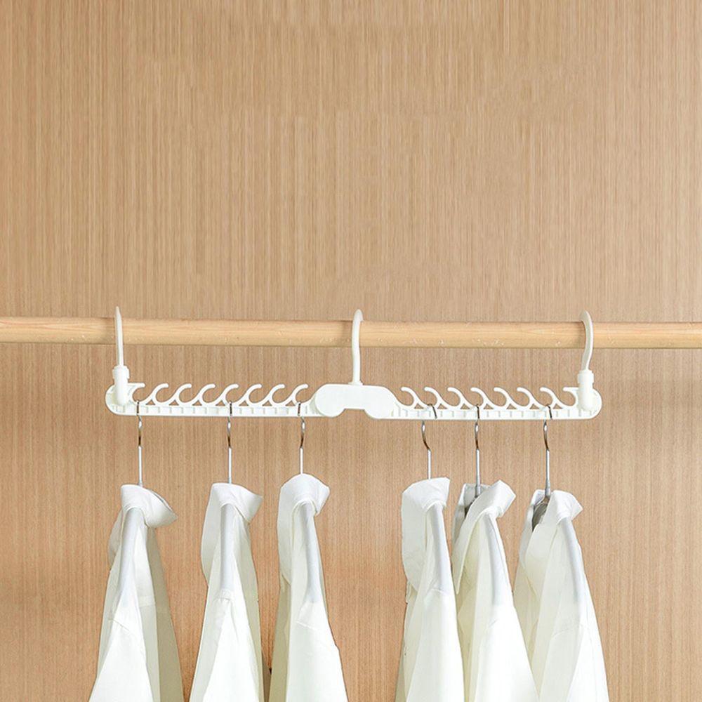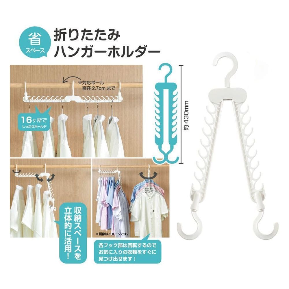 折りたたみハンガーホルダー省スペースに使える折りたたみハンガーホルダー。半分に折りたたみが出来るので、収納スペースを立体的に活用できます。16箇所でしっかりホールドすることができます。各フック部は回転するのでお気に入りの衣類をすぐに見つけ出せます。【仕様】対応ポール:直径2.7cmまで
