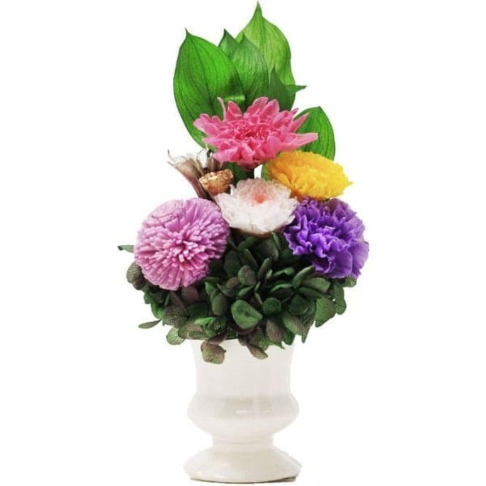 自宅のご仏壇にお供えするプリザーブド仏花。花器付きだから、すぐにお供えできます。プリザーブドフラワーのため水やり、お手入れがいりません。長期間(目安1年程度)交換不要で美しい状態のままです。生花を加工したものなので、造花が苦手な方でもためらうことなくお供えできます。全て天然素材のものを使用。造花は一切使用しておりません。長期間使用できるので経済的!プリザーブド加工(自然のお花や木に特殊な液体を吸わせたりすることで長持ちさせる加工)を施しているので、長く楽しむことができます。クリアケースに入っているのでホコリをかぶる心配もいりません。ひとつひとつハンドメイド製作。A&K社の商品は全て天然素材の花材を使用し、一切造花は使用しておりません。また、全ての商品をハンドメイド(手作り)で行っています。国産品、国内製造にこだわりを持った商品です。