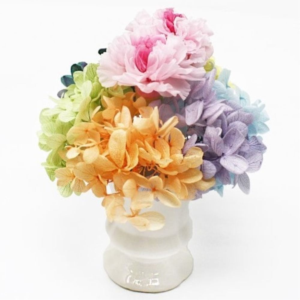 プリザーブドフラワーは人間が生活する中で快適な状況であれば長持ちします。ただ、直射日光やエアコンなどの冷暖房風には弱いのでそういった場所を避けてご使用ください。水やりはしないでください。