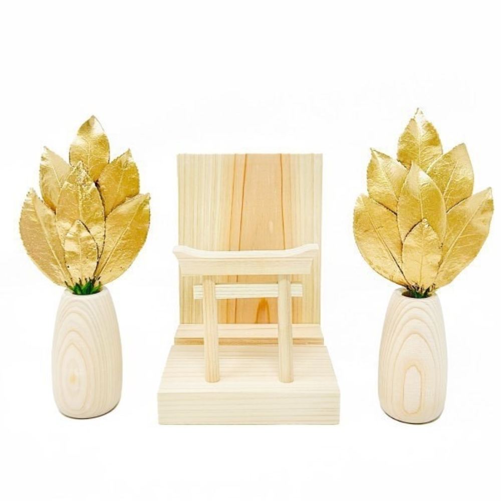 金のプリザーブド榊と鳥居付き神棚、榊立てのセット。プリザーブド加工を施し金色に染めた榊となっており、長期間(目安約1年~)交換不要でご使用いただけます。独特の製法(実用新案第3222297号)にて型崩れ等が起こりにくくなっております。一対セットです。(2本組)榊立て、神棚は全て国産のヒノキ製です!日本で唯一の国産、金のプリザーブド榊。水やり不要・交換不要で経済的で、毎日の作業を軽減。生花を特殊加工することで長期間水やり不要で飾れます。目安として約1年程度お使いいただけます。(使用環境による)造花に抵抗があっても、この商品は本物を加工したものなので安心してご使用いただけます。ひとつひとつ丁寧に手作りで作っております。生花と同じように少しづつ違いがあります。職人の手作り!シンプルなデザインでどのお部屋でも気軽に飾れます。部屋の雰囲気にも溶け込むモダンタイプです。ヒノキの良い部分だけを厳選し、ひとつひとつ丁寧に作り上げています。