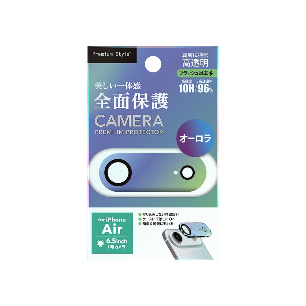 「PG-25CCLG04AR」は、カメラ周りを鮮やかに彩るオーロラデザインのiPhone Air用 カメラフルプロテクターです。 光線透過率96%の表面硬度10H光沢ガラスと薄くて耐久性に優れたアクリル素材で一体成形されており、端末本体のカメラレンズ周りにキズを付けず、美しくカメラレンズ守ります。 貼り付け時に便利なクリーニングクロス・ほこり取りシール付き。 また、プロテクターが剥がしにくい場合に便利な取り外し用リムーバーを付属しています。