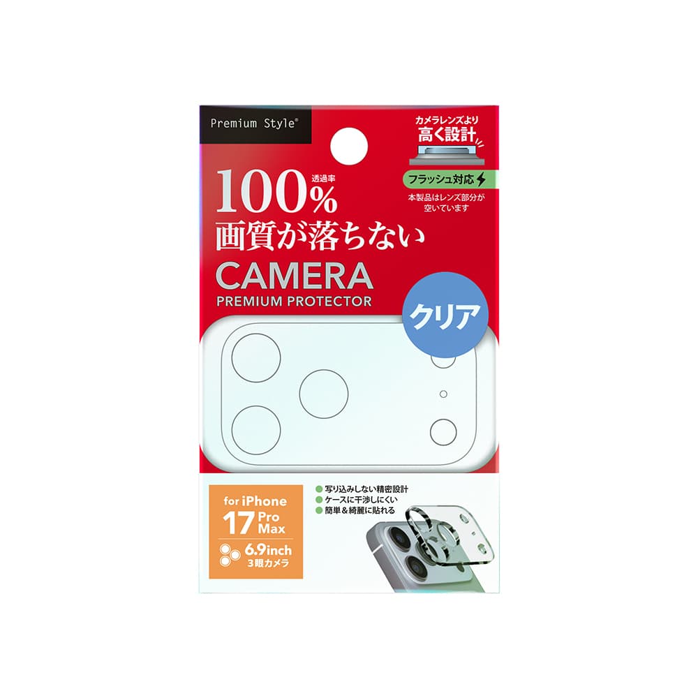 「PG-25DLGD01CL」は、カメラレンズ周りをキズから守るiPhone 17 Pro Max用 カメラレンズフレーム クリアです。 iPhone本体の美しさを活かすクリアタイプ。 カメラレンズ部分が空いている為、撮影時の画質に影響がありません。 iPhone本体のカメラの高さよりカメラレンズフレームは高く設計されている為、カメラ側を下にして端末を平面に置いた時、カメラレンズが接地しません。 貼り付け時に便利なクリーニングクロス・ほこり取りシール付き。 また、レンズフレームが剥がしにくい場合に便利な取り外し用リムーバーを付属しています。