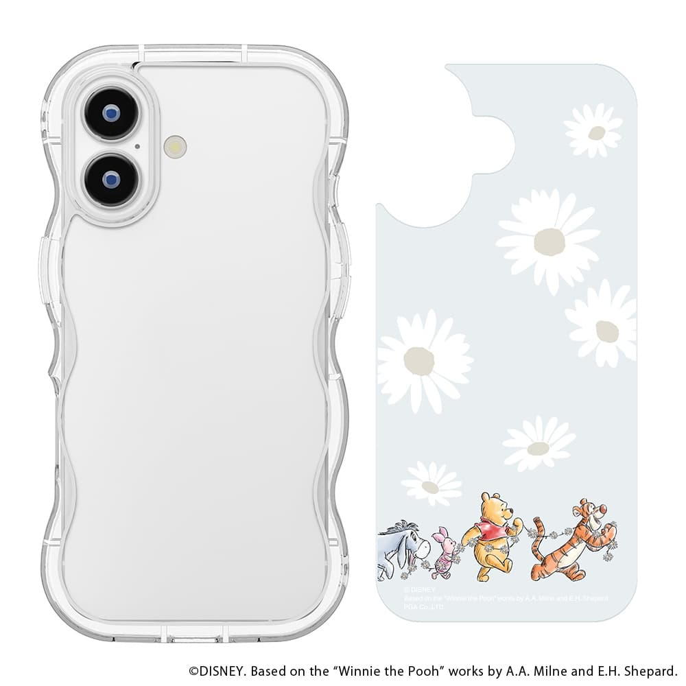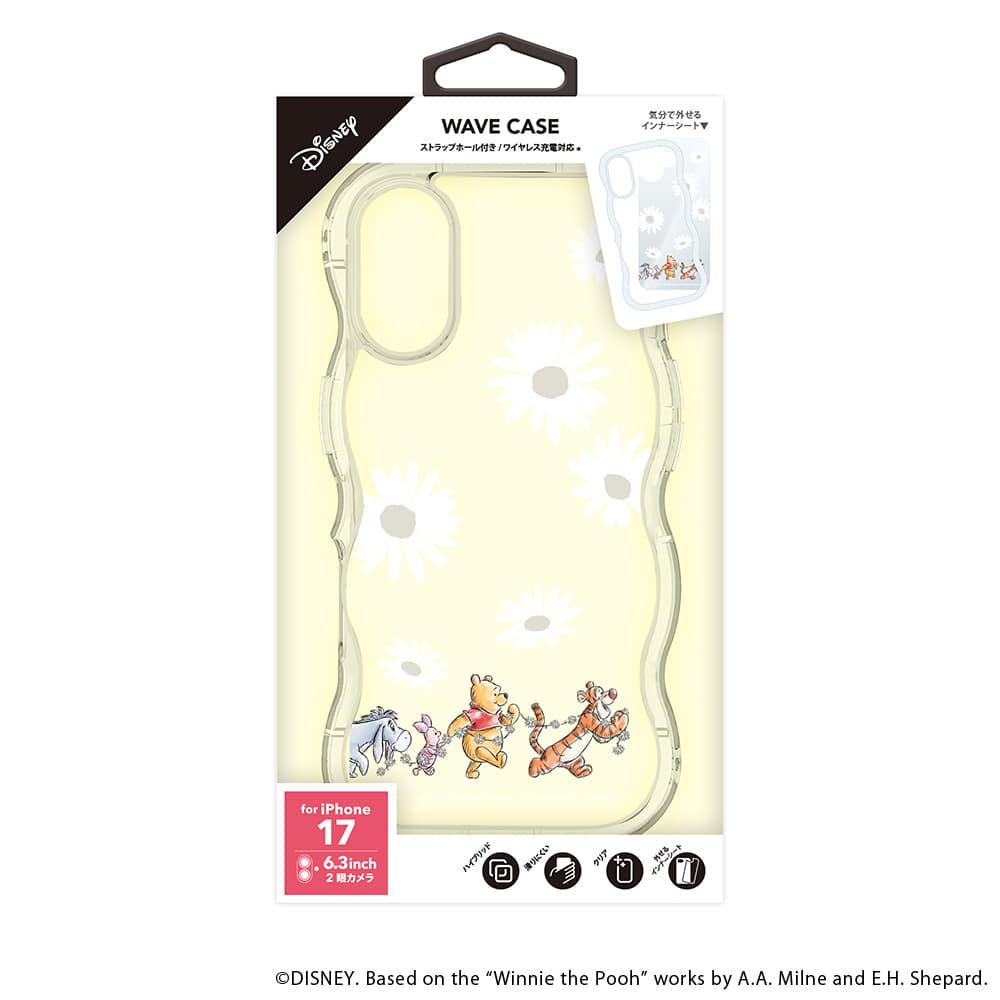 「PG-D25AWH04POO」は、ディズニーキャラクターデザインの着せ替えシートがセットになったiPhone 17用 ウェーブケースです。 iPhone本体の色を活かす透明タイプの着せ替えシートは気分に合わせて取り外しが可能です。 波打つデザインが可愛らしいウェーブケースは、耐久性のあるポリカーボネイトとしなやかなTPUを組み合わせたハイブリッド設計で端末本体をしっかり保護します。 ケースを付けたままワイヤレス充電が可能です。 お手持ちのストラップをつけて落下を防げるストラップホール付き。