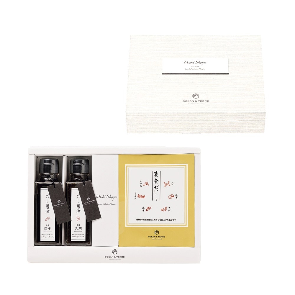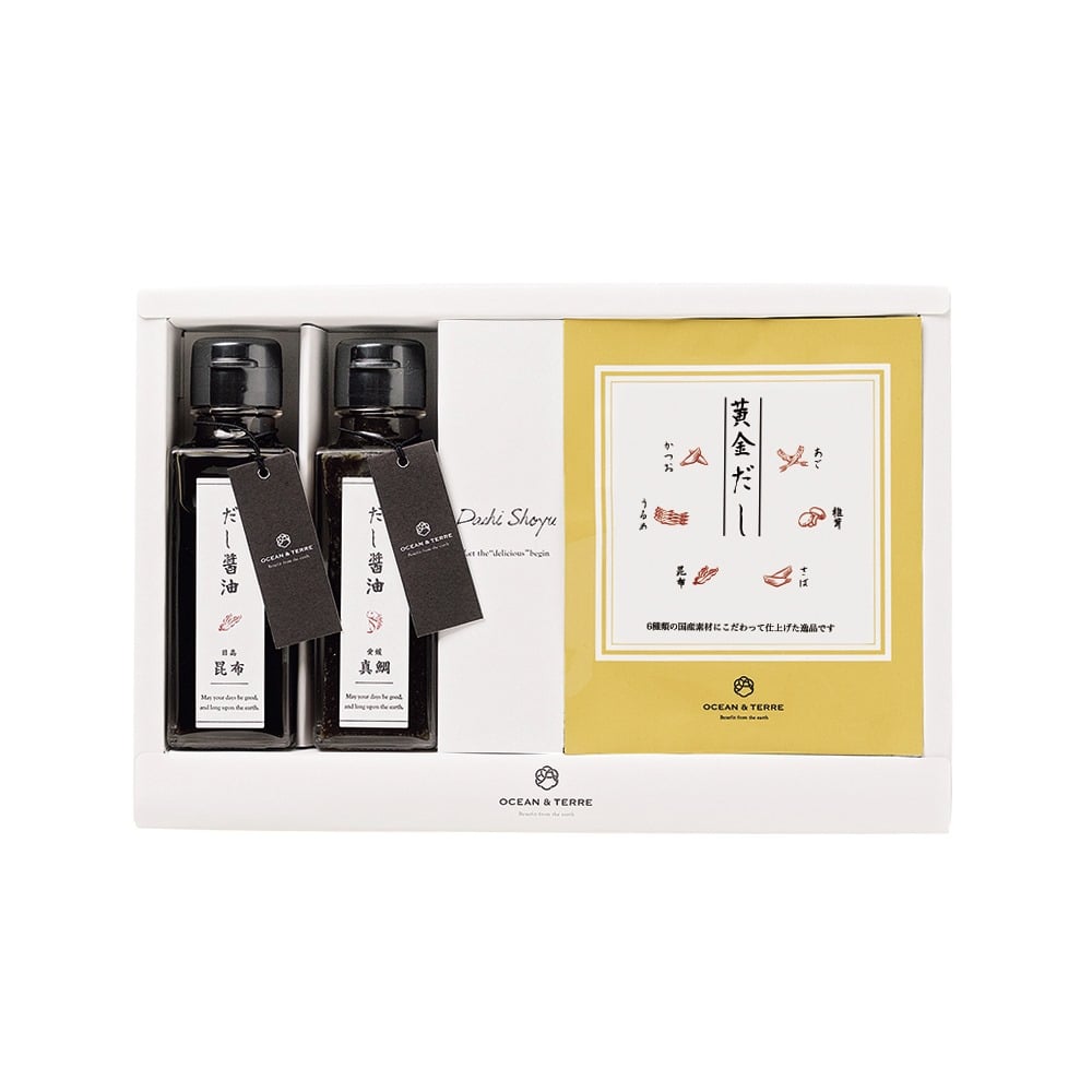 【北海道日高昆布醤油】しょうゆ(本醸造)(国内製造)、昆布エキス、清酒、砂糖、かつお節エキス、オリゴ糖、食塩、酵母エキス、たん白加水分解物/調味料(アミノ酸等)、増粘剤(キサンタン)、酒精、(一部に小麦・大豆を含む)【愛媛県真鯛醤油】しょうゆ(本醸造)(国内製造)、アミノ酸液、醸造調味料、砂糖、鯛エキス、かつお節エキス、食塩、昆布エキス、酵母エキス、たん白加水分解物、醸造酢/調味料(アミノ酸等)、酒精、酸味料、(一部に小麦・大豆を含む)【黄金だしパック】風味原料(かつお粉末(国内製造)、いわし粉末、さば粉末、あご(とびうお)粉末、椎茸粉末、昆布粉末、昆布エキス)、ぶどう糖、食塩、粉末しょうゆ/調味料(アミノ酸等)、着色料(カラメル)、酒精、(一部に小麦・さば・大豆を含む)