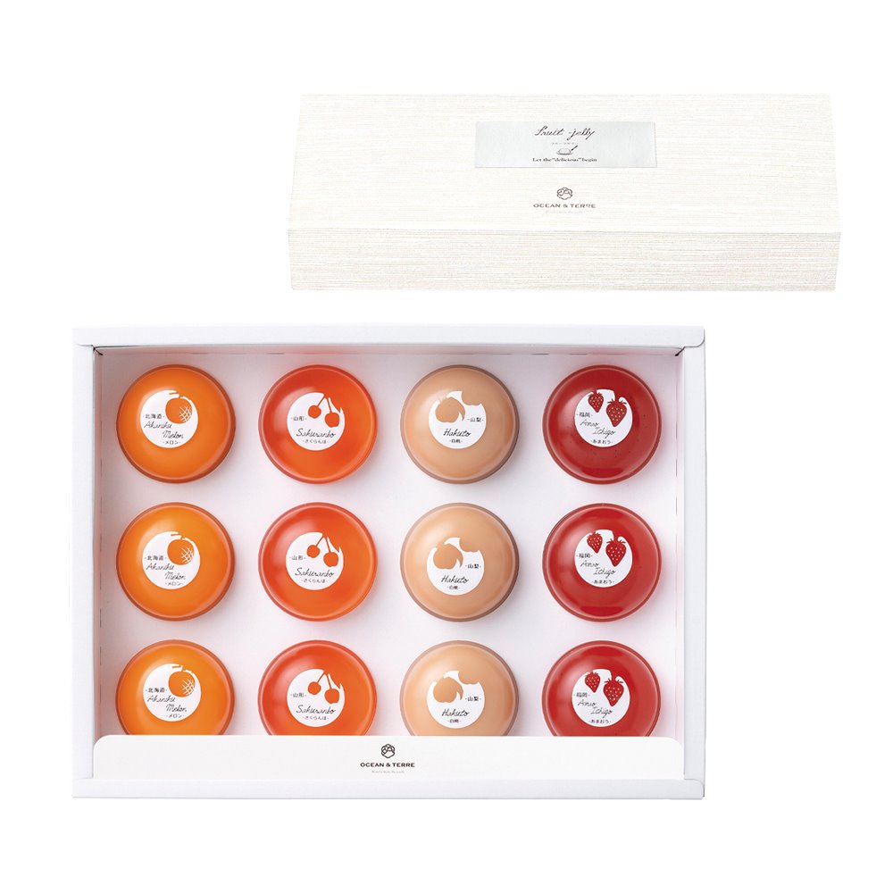 【北海道 赤肉メロンゼリー】砂糖・ぶどう糖果糖液糖(国内製造)、メロンピューレ、グラニュー糖、加糖れん乳/ゲル化剤(増粘多糖類)、酸味料、香料、着色料(カロテン)、(一部に乳成分を含む)【山形県 さくらんぼゼリー】砂糖・ぶどう糖果糖液糖(国内製造)、さくらんぼ果汁、グレナデンシロップ、グラニュー糖、寒天/酸味料、ゲル化剤(増粘多糖類)、香料、酸化防止剤(酵素処理ルチン)、着色料(カラメル、赤102)【山梨県 白桃ゼリー】砂糖・ぶどう糖果糖液糖(国内製造)、もも果汁、ももピューレ、グラニュー糖、加糖れん乳/ゲル化剤(増粘多糖類)、酸味料、酸化防止剤(酵素処理ルチン)、香料、(一部に乳成分・ももを含む)【福岡県 あまおう苺ゼリー】グラニュー糖(国内製造)、グレナデンシロップ、いちごピューレ、レモン果汁/ゲル化剤(増粘多糖類)、酸味料、香料、酸化防止剤(酵素処理ルチン)、着色料(カラメル、赤102)