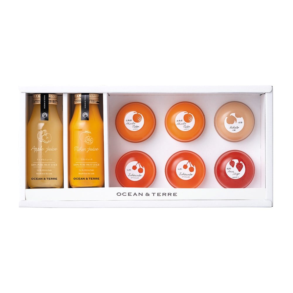 本格ジュースと可愛らしいゼリーのセットです。アップルジュース180ml×1、ミカンジュース180ml×1、北海道 赤肉メロンゼリー72g×2、山形県 さくらんぼゼリー72g×2、山梨県 白桃ゼリー72g×1、福岡県 あまおう苺ゼリー72g×1
