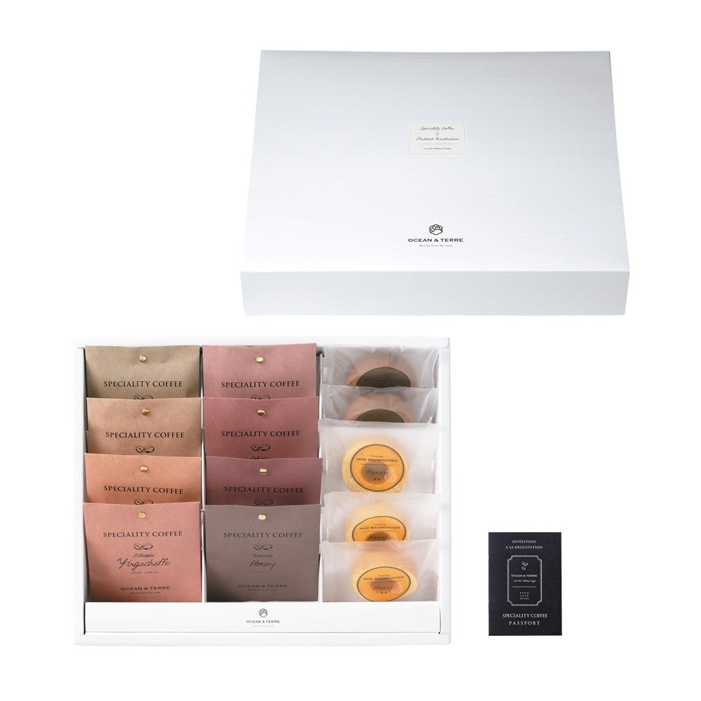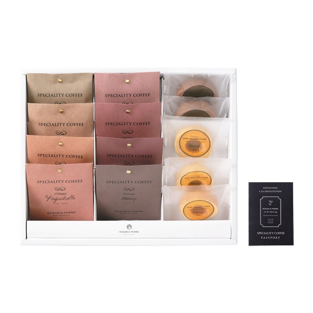 世界各国の厳選された、希少価値あるスペシャルティコーヒーとバームクーヘンのセット。ほっとする憩いの時間をお楽しみください。 ドリップ珈琲(ミャンマー スターマウンテン、ブラジル ショコラ、コスタリカ ハニー、エチオピア イルガチェフェ、インドネシア ガヨマウンテン、コロンビア ヴァィラファティマ、メキシコ オアハカオーロラ、タンザニア ハニー)8種(各8g×1)、はちみつバーム×3、ベルギーチョコバーム×2、パスポート付(スペシャルティコーヒー説明書)