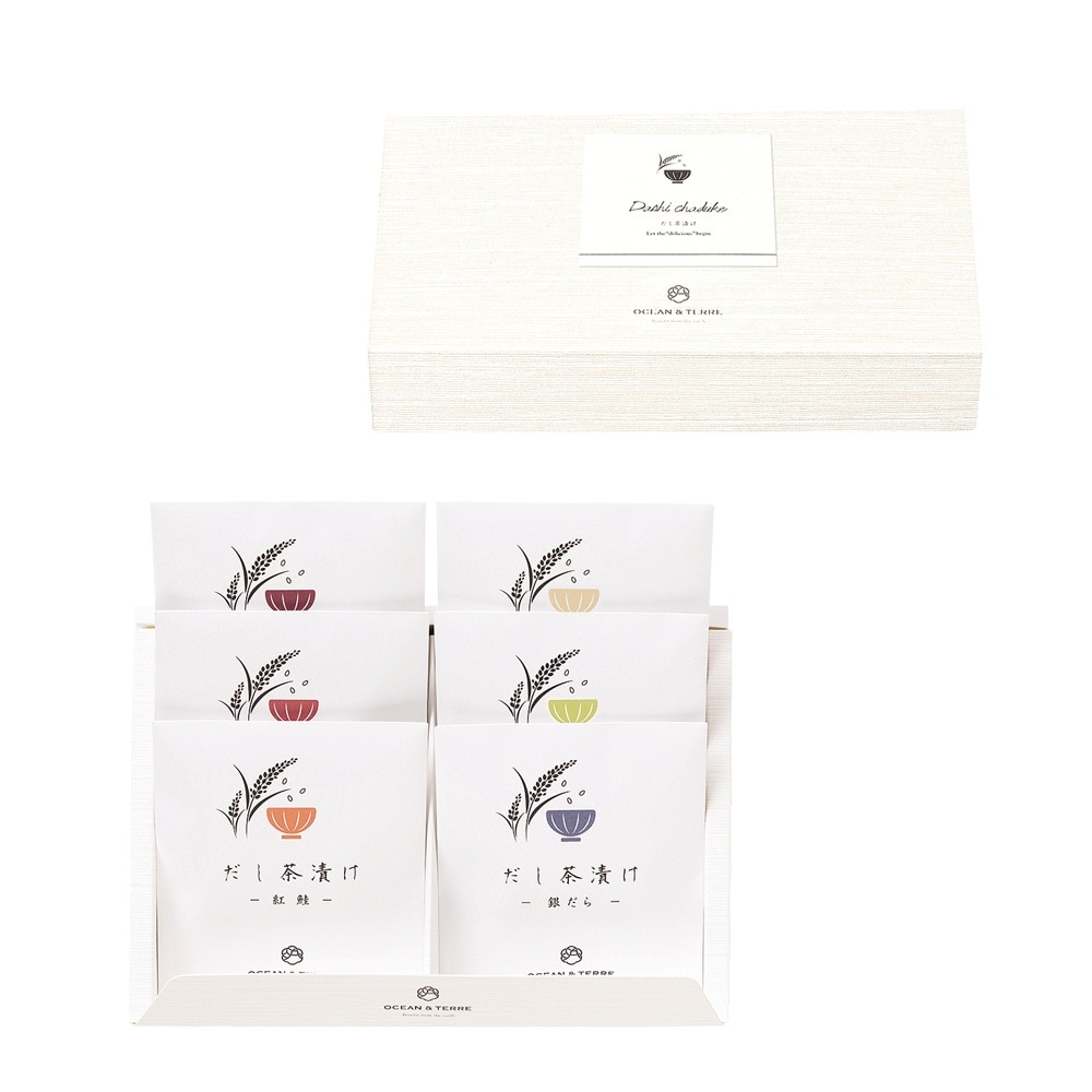 北海道産真昆布を使い、静岡県産抹茶の風味を利かせた、贅沢なだし茶漬けです。 だし茶漬けの素4.5g×6、はまぐり2個×1、ずわい蟹13g×1、紅鮭1切×1、帆立2~4個×1、紀州南高梅1粒×1、銀だら1切×1、白煎りごま1g×6