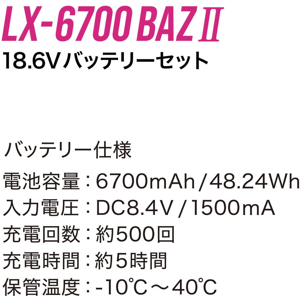 ●ファンバッテリーセット品です。●「COOLING BLAST PRO」から新モデルが登場!!●最大出力18.6V(風量:100L)の大風量の風が全身を駆け巡り冷やします。●気温が高い時間帯は18.6Vモードの短時間使用がおすすめです。●4段階の風量調節でお好みの風量に調整ください。●必ず18.6V対応ファンセットをご使用ください。●最大風量:100L●充電時間:約5時間●出力(V):18.6V、15V、12V、8V●連続稼働時間:連続稼働時間:(表示4)(18.6V )約2.5時間、(表示3)(15V)約4時間、(表示2)(12V)約8.5時間、(表示1)(8V)約24時間以上(連続稼働時間は満充電時の値、着用条件や環境などの違いに応じて稼働時間が異なる)●電池容量:6700mAh、48.24Wh●入力電圧(V):DC:8.4V 1500mA●充電回数:約500回 質量327g