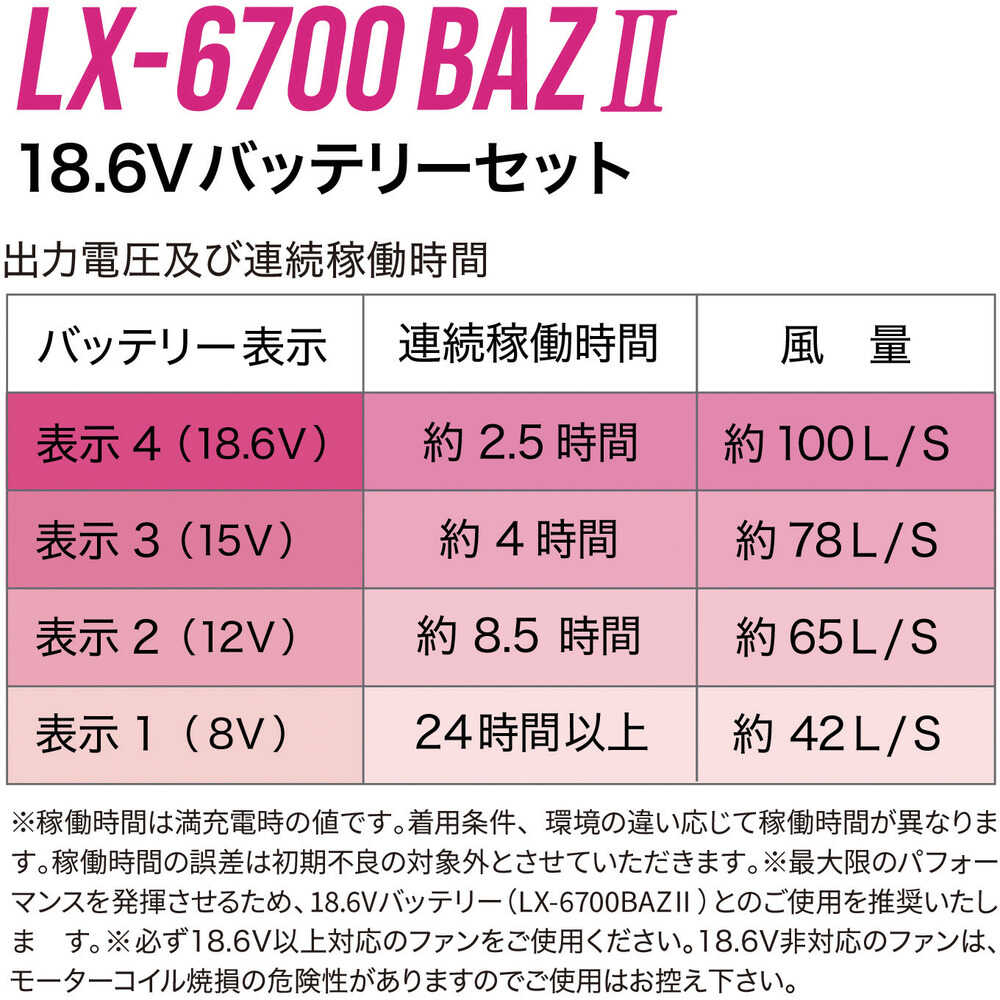 ●18.6V(表示4)での運転には必ず18.6V対応ファンをご使用ください。●防水仕様ではございません。●粉塵の多い場所では使用しないでください。