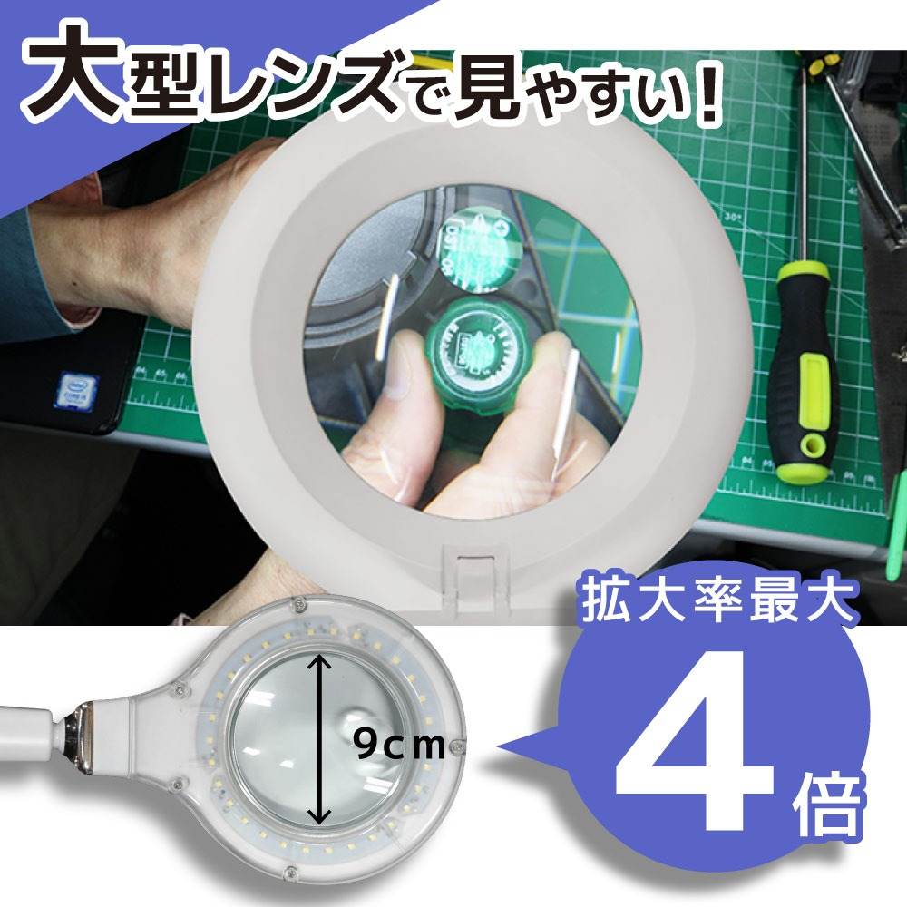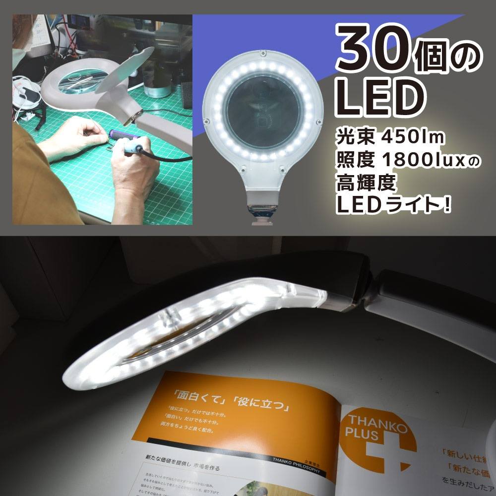 30個LEDライト付きルーペ。無段階調整可能なスタンド式 細かい作業をする時に使える、ライト付きのスタンドルーペです。 30個の高輝度LEDライトで、手元を明るく照らします。 アーム部は無段階調整可能でスムーズに高さ調整可能。 スタンド式でどこでも使うことができます。 光束は450lm、照度は1800luxでとても強力。 集中して作業することができます。