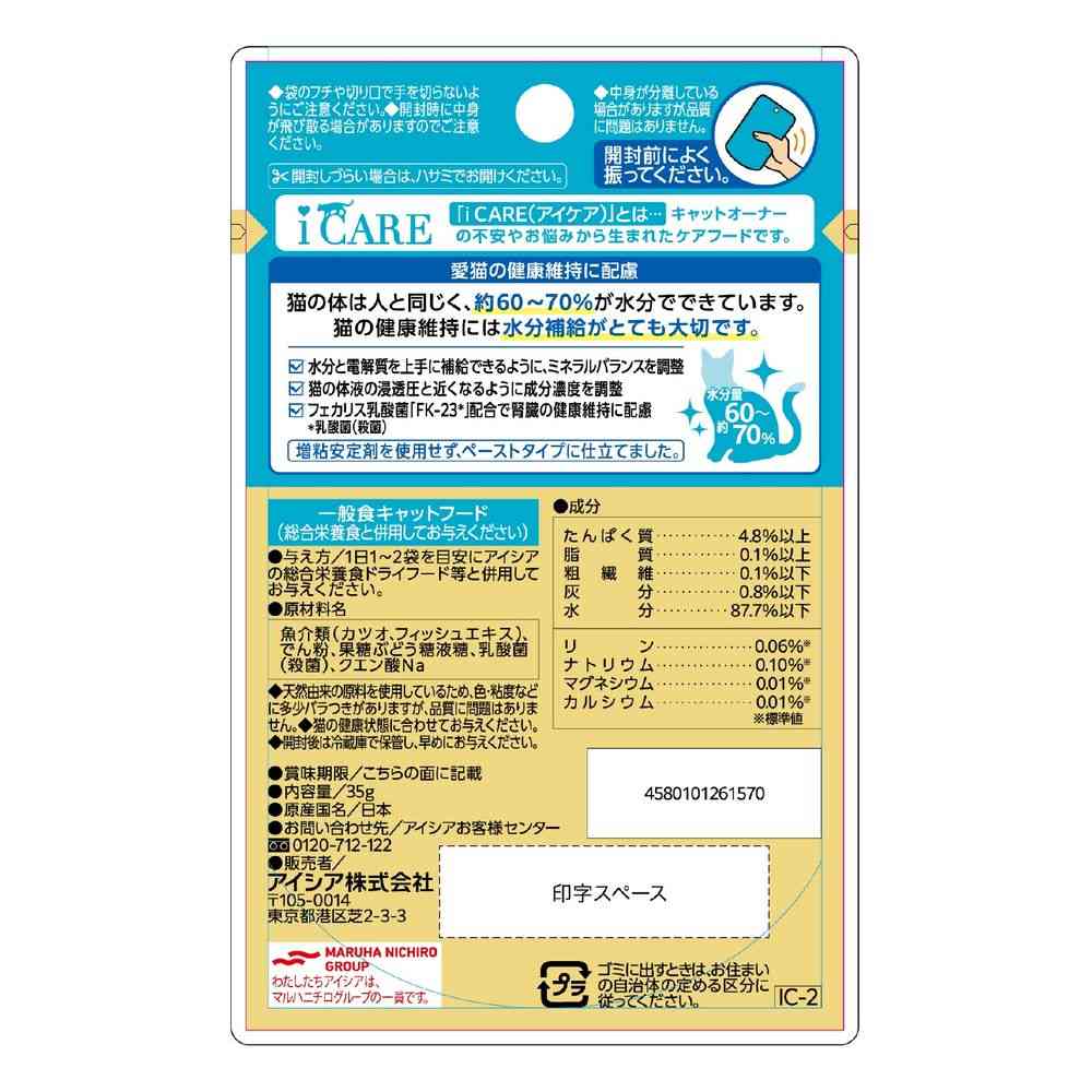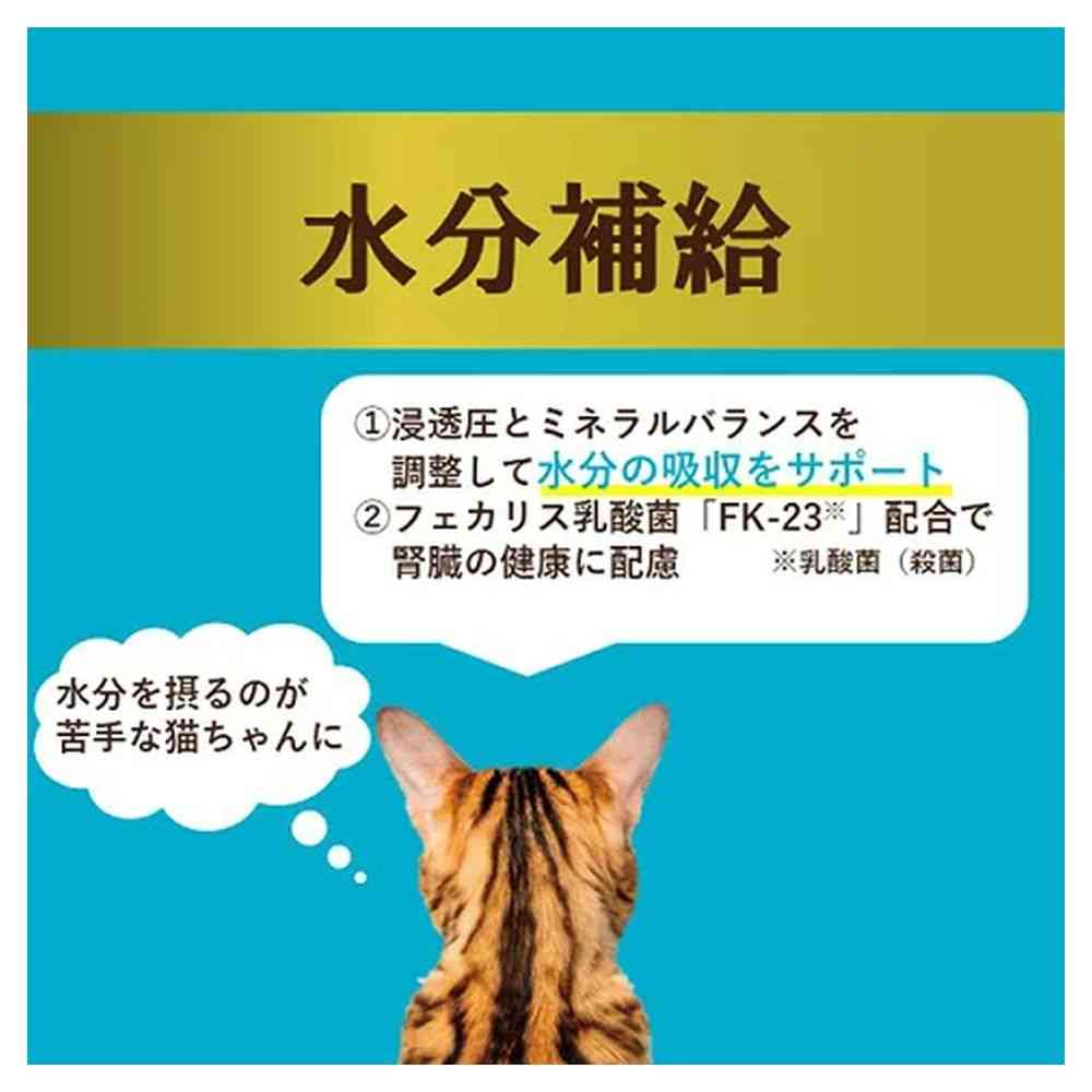 水分と電解質を上手に補給できるように、ミネラルバランスを調整。 猫の体液の浸透圧と近くなるように成分濃度を調整。 腎臓の健康維持に配慮し、フェカリス乳酸菌「FK-23」を配合。 さらに、リンとナトリウムを調整。 着色料・発色剤・香料・増粘安定剤不使用。 ペーストタイプ。