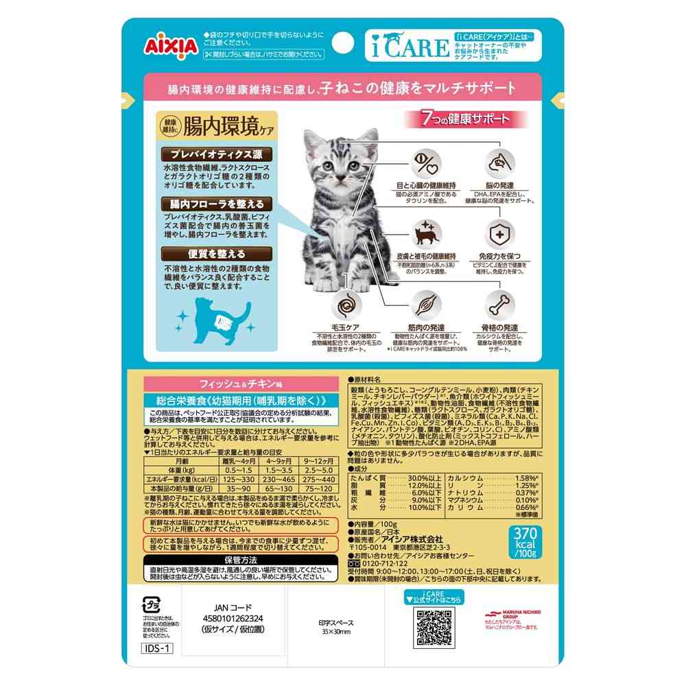 腸内環境の健康維持に配慮して、プレバイオティクス源の水溶性食物繊維、ラクトスクロースとガラクトオリゴ糖の2種類のオリゴ糖を配合。 プレバイオティクス、乳酸菌、ビフィズス菌が腸内の善玉菌を増やし、腸内フローラを整える。 さらに、不溶性と水溶性の2種類の食物繊維をバランス良く配合することで、良い便質に整える。 子猫の健康な成長に配慮した設計。