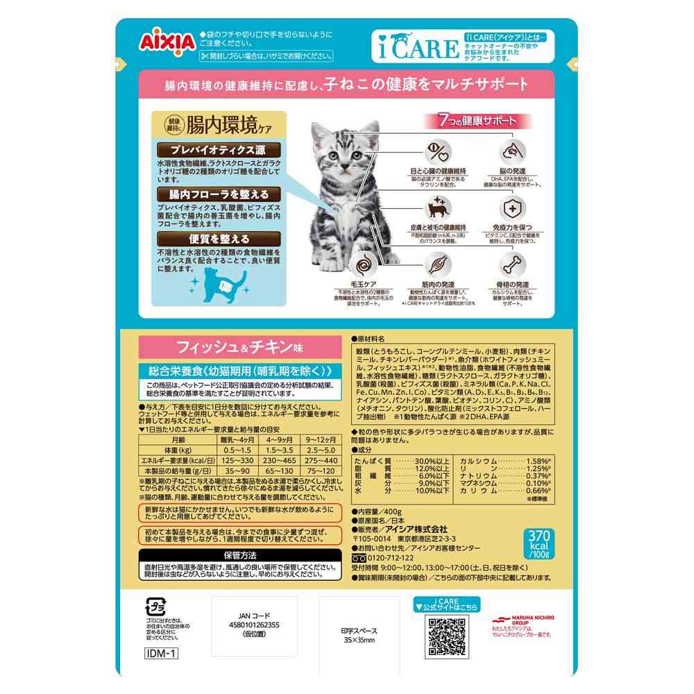 腸内環境の健康維持に配慮して、プレバイオティクス源の水溶性食物繊維、ラクトスクロースとガラクトオリゴ糖の2種類のオリゴ糖を配合。 プレバイオティクス、乳酸菌、ビフィズス菌が腸内の善玉菌を増やし、腸内フローラを整える。 さらに、不溶性と水溶性の2種類の食物繊維をバランス良く配合することで、良い便質に整える。 子猫の健康な成長に配慮した設計。