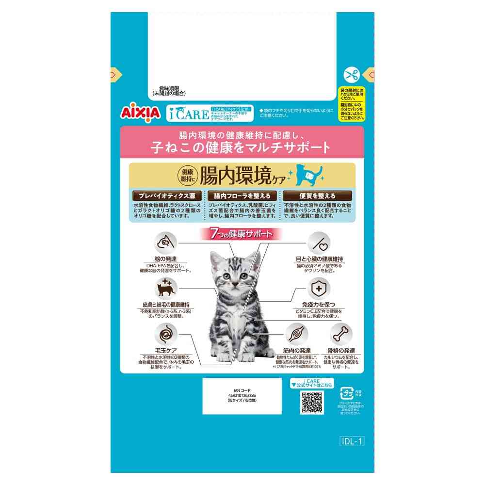 腸内環境の健康維持に配慮して、プレバイオティクス源の水溶性食物繊維、ラクトスクロースとガラクトオリゴ糖の2種類のオリゴ糖を配合。 プレバイオティクス、乳酸菌、ビフィズス菌が腸内の善玉菌を増やし、腸内フローラを整える。 さらに、不溶性と水溶性の2種類の食物繊維をバランス良く配合することで、良い便質に整える。 子猫の健康な成長に配慮した設計。