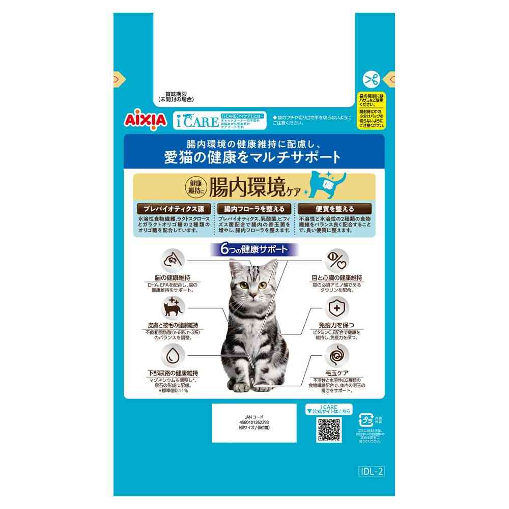 腸内環境の健康維持に配慮して、プレバイオティクス源の水溶性食物繊維、ラクトスクロースとガラクトオリゴ糖の2種類のオリゴ糖を配合。 プレバイオティクス、乳酸菌、ビフィズス菌が腸内の善玉菌を増やし、腸内フローラを整える。 さらに、不溶性と水溶性の2種類の食物繊維をバランス良く配合することで、良い便質に整える。 成猫の健康維持に配慮した設計。