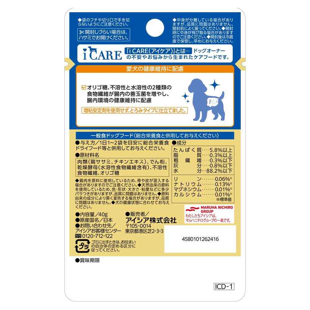肉類(鶏ササミ、チキンエキス)、でん粉、乾燥酵母(水溶性食物繊維含有)、不溶性食物繊維、オリゴ糖 たんぱく質:5.8%以上、脂質:0.3%以上、粗繊維:0.3%以下、灰分:0.8%以下、水分:88.2%以下