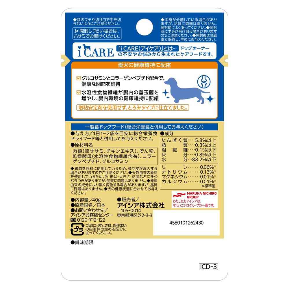 肉類(鶏ササミ、チキンエキス)、でん粉、乾燥酵母(水溶性食物繊維含有)、コラーゲンペプチド、グルコサミン たんぱく質:5.8%以上、脂質:0.3%以上、粗繊維:0.1%以下、灰分:0.8%以下、水分:88.2%以下