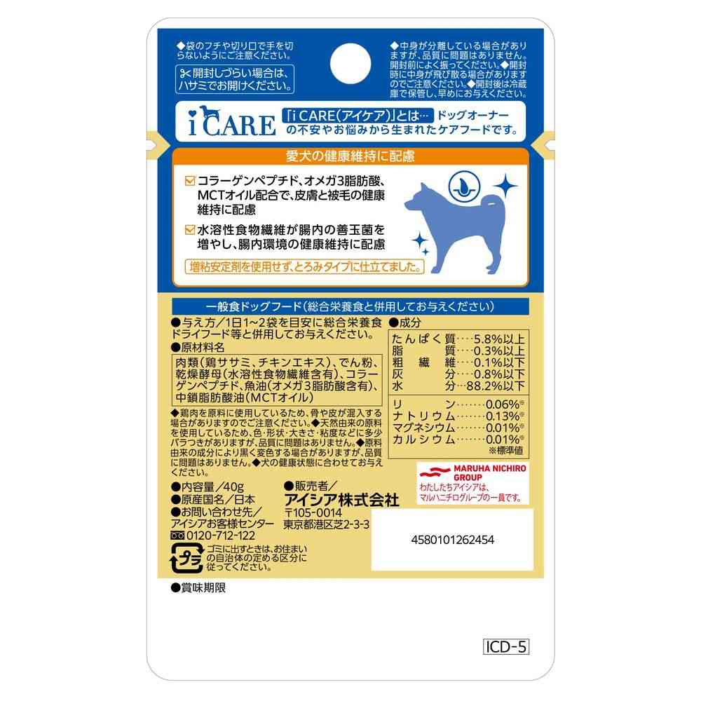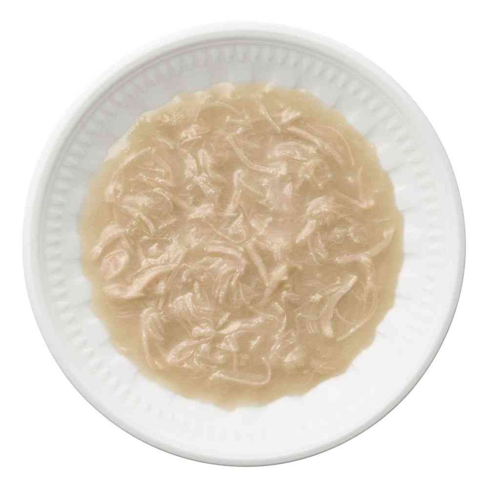 肉類(鶏ササミ、チキンエキス)、でん粉、乾燥酵母(水溶性食物繊維含有)、コラーゲンペプチド、魚油(オメガ3脂肪酸含有)、中鎖脂肪酸油(MCTオイル) たんぱく質:5.8%以上、脂質:0.3%以上、粗繊維:0.1%以下、灰分:0.8%以下、水分:88.2%以下
