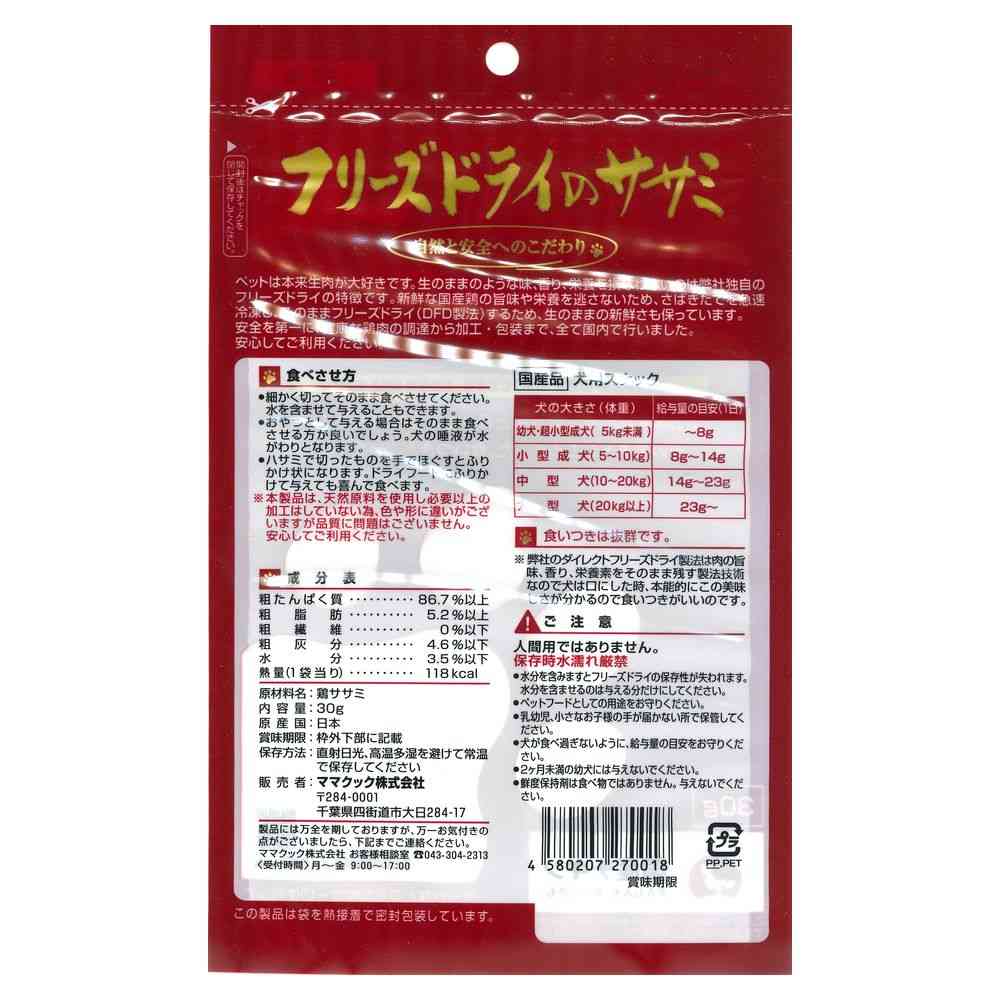 - > ママクック フリーズドライのササミ 犬用