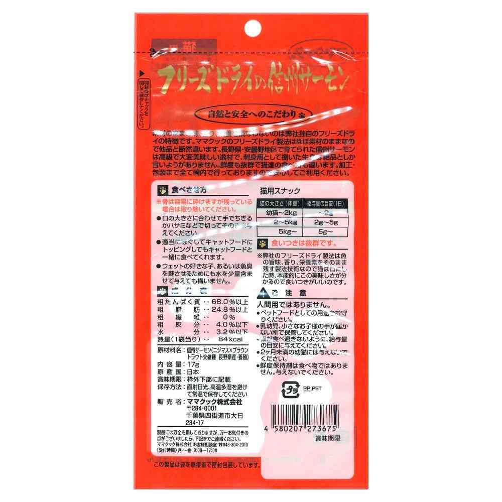 長野県産の信州サーモンを使用。 水を含ませると魚の香りが戻り、食いつきが変わります。 もちろんおやつにも、いつものごはんのトッピングにも使えます。