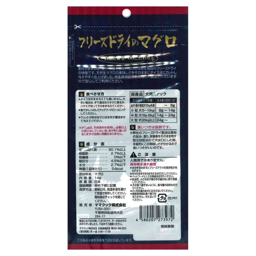 厳選した国産マグロを使用。 DHA、EPAを含み、高たんぱく、低カロリーなマグロを、贅沢にフリーズドライしました。 おやつにも、いつものごはんのトッピングにも使えます。