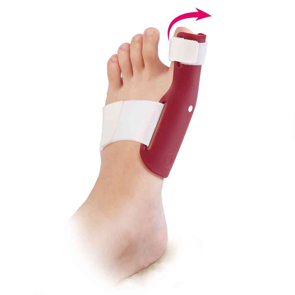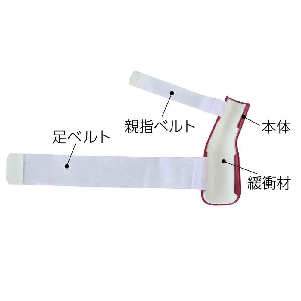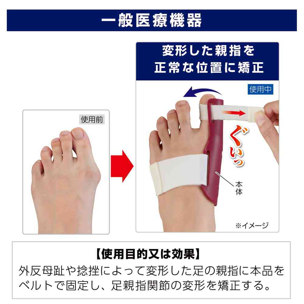 就寝中に外反母趾により変形した親指を正常な位置に矯正して治療を補助する一般医療機器(左足用)です。 足指形状に合わせた本体を親指外側にベルトで固定して、曲がった親指を外側に引っ張り矯正します。 ベルトは調整可能なので症状に合わせて矯正できます。
