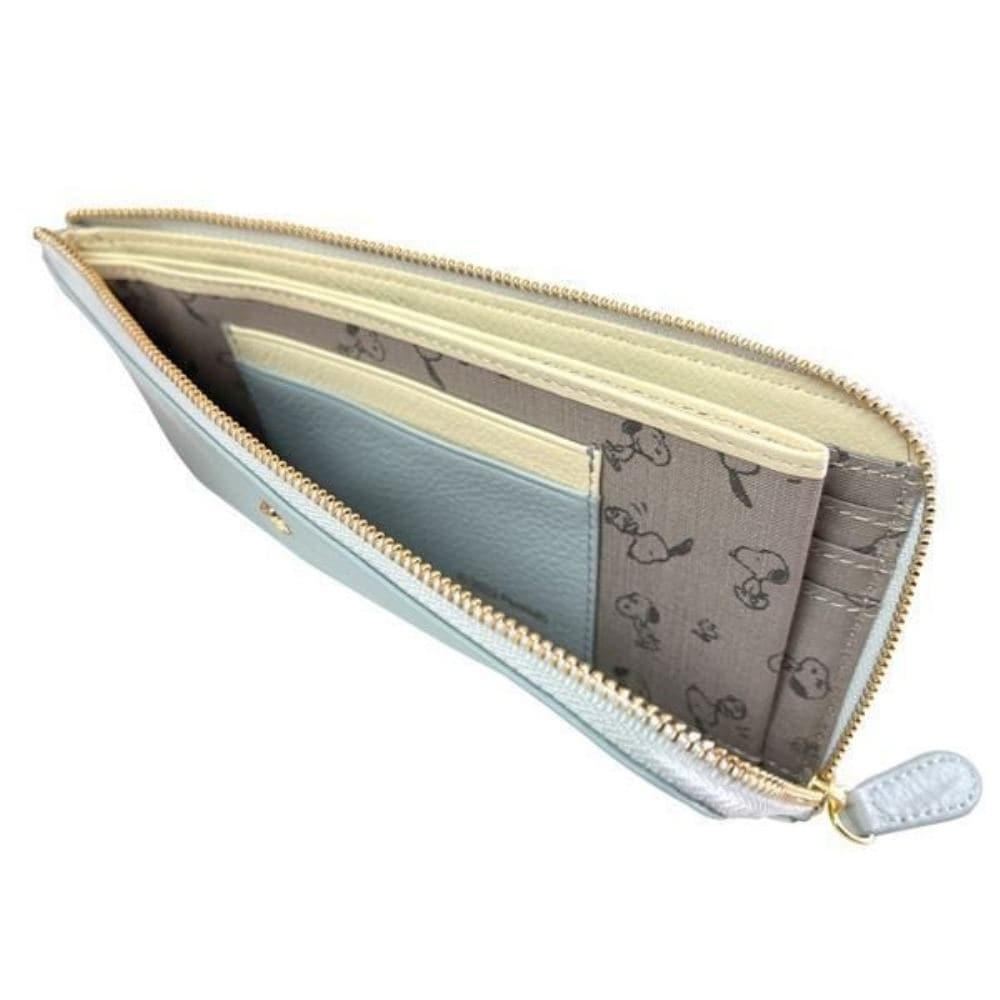 毎日をスヌーピーと一緒に過ごせる!かわいらしいデザインを落とし込んだ、日常で使える大人のための 本格的なレザー雑貨ブランド!ファスナーを開けだけのワンアクションでお札、コイン、カードがすぐに取り出せるので、使いやすいのが魅力です。ゴールドの小さなスヌーピーのチャームが大人っぽいあしらいになっています。内生地は可愛いスヌーピー柄です。柔らかい牛革を使用してます。くすみパステルカラーがキュートなスリムLF長財布です!