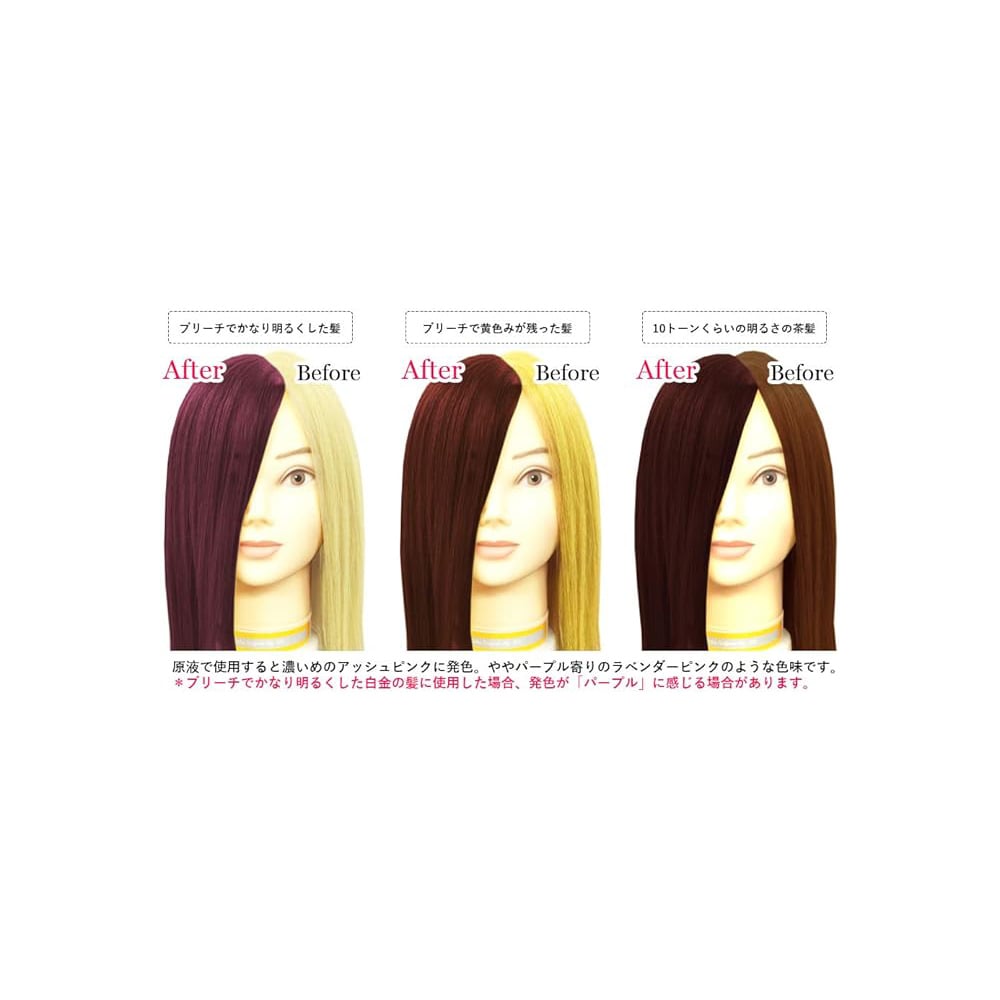 ■まれに化粧品等でアレルギー反応を起こす場合がございますので使用する前に必ずパッチテスト(皮膚試験)を行ってからご使用ください。■使用前の髪色や明るさ、髪質やダメージ度合によって染まり方が大きく異なります。はじめに襟足や耳裏等の目立たない箇所で発色テストをしてからご使用ください。※黒髪・白髪には色は入りません。■染まりが不十分な場合、塗りもれや塗布量が少ない等の原因が考えられます。髪が隠れる程度まで多めに塗布してください。■爪や手・衣服に色が付かないよう、ゴム手袋やカラーケープ等をご使用ください。■染髪後、2~3日は汚れても良いタオルをご使用ください。色が付着する可能性があります。■壁や床、バスタブ、タイル、シンク等への色移りにご注意ください。■衣服や帽子、枕等への色移りにご注意ください(特に髪が濡れた状態の場合)。■お肌に異常が生じていないかよく注意して使用してください。化粧品がお肌に合わないとき即ち次のような場合には、使用を中止してください。そのまま化粧品類の使用を続けますと、症状を悪化させることがありますので、皮膚科専門医等にご相談されることをおすすめします。(1)使用中、赤味、はれ、かゆみ、刺激等の異常があらわれた場合。(2)使用したお肌に、直射日光があたって上記のような異常があらわれた場合。■頭髪以外には使用しないでください。■使用後は、必ず洗い流してください。■本品は食べ物ではございません。■乳幼児の手の届かない場所に保管してください。■眼に入った場合は、直ちに水かぬるま湯で洗い流し、眼科専門医の診断を受けてください。■極端に高温低温多湿、蛍光灯などの光や直射日光に当たる場所等で保管しないでください。■商品開封後出来るだけ早くお使いください。