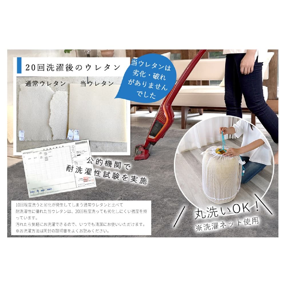 組成:ポリエステル100%(マイクロファイバー) 中材:洗えるウレタン+洗える高反発ウレタン 裏面:不織布 NP ドット 耐熱性滑り止め(PVC)