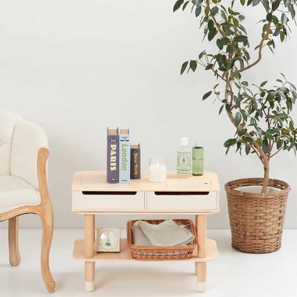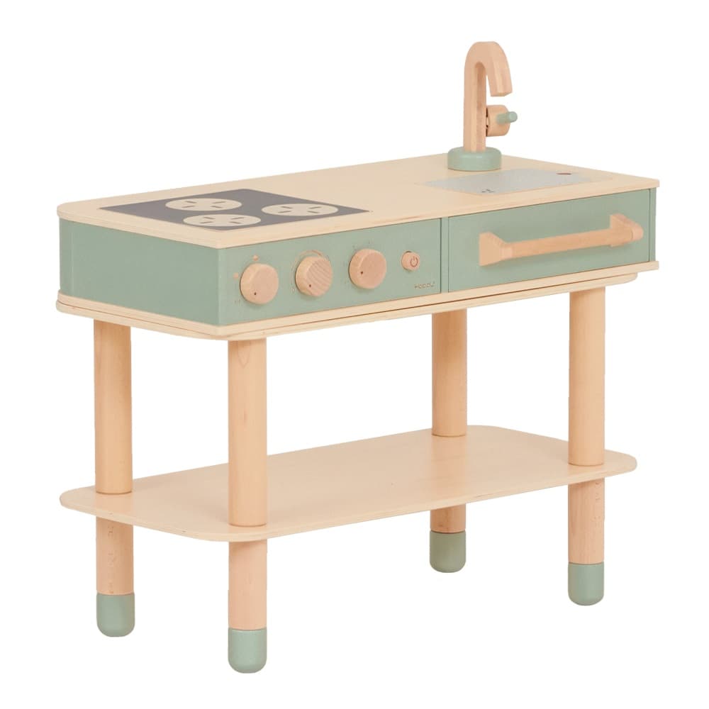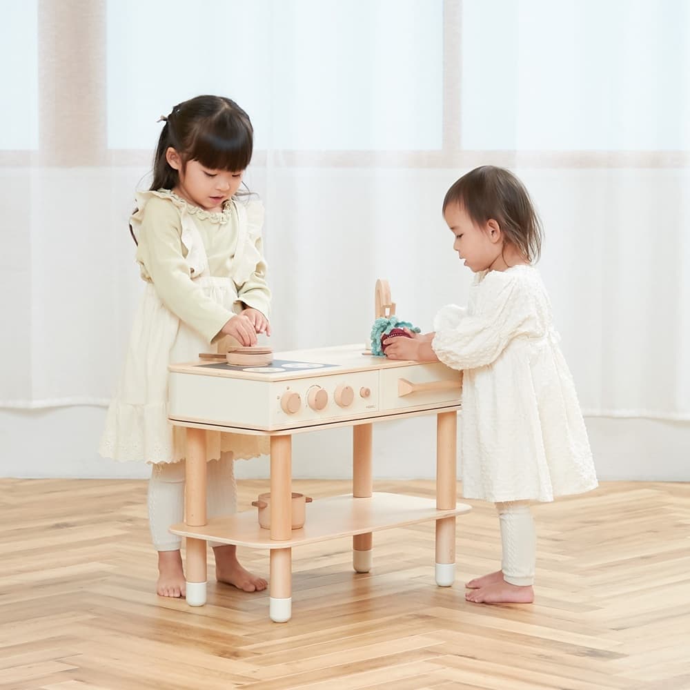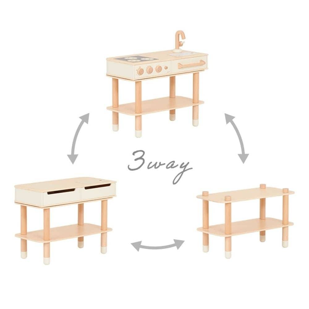 『インテリアをあきらめない、ワンランク上のままごとキッチン』 コンパクトなチェストタイプのままごとキッチン。 ひっくり返すだけで、コロコロと使い方が変化するリバーシブルの引き出し&天板の仕掛けで、お子様が大きくなってもお家で活躍するインテリアに変身します。丸みのあるかたちと落ち着いたカラーは、お部屋をやさしく彩ります。 定位置にカチっとくっつく蛇口や、音や押し心地が楽しいつまみ・ボタンなど、お子様の興味を引き出す工夫が詰まったままごとキッチンです。 キッチンの引き出しはリバーシブル仕様となっており、前後でタオル掛けやコンロのつまみなどおままごと用としてや、シンプルな引き出しとして使い分けることが可能です。天板のコンロとまな板部分も裏返すことで無地の木目に変わり、シンプルな引出しと組み合わせることでドレッサーやサイドテーブルとしてもご使用いただけます。 コロコロデスクと組み合わせることでお店屋さんごっこや調理遊びなど遊びの幅が広がります。 対象年齢は3歳~ 工具不要でお一人でも簡単に組み立てが可能です。 2024キッズデザイン賞受賞。