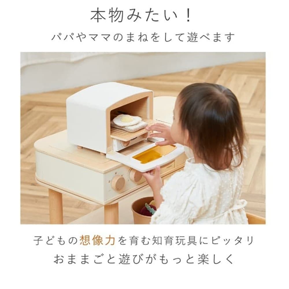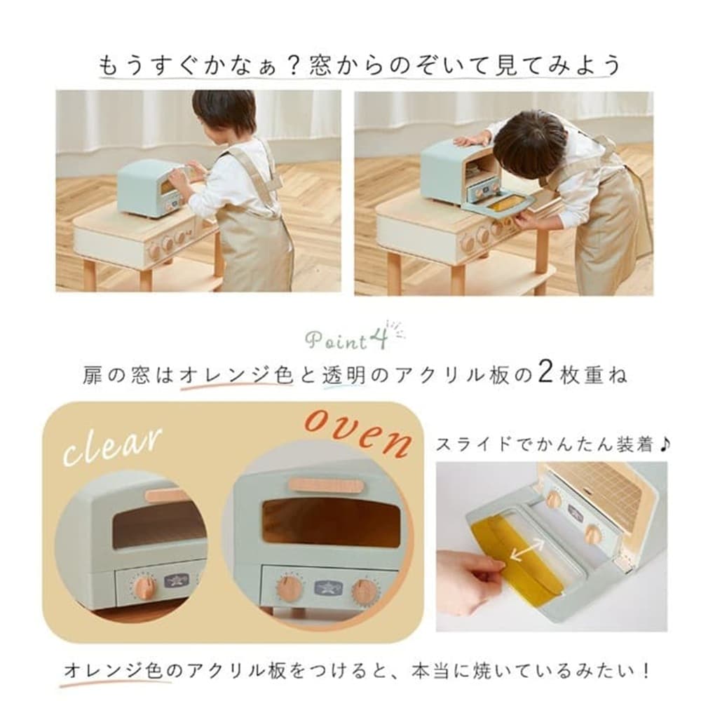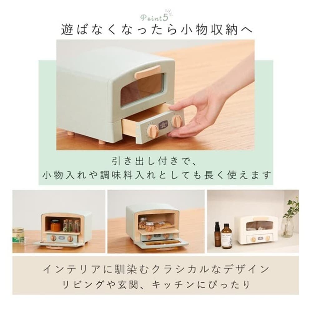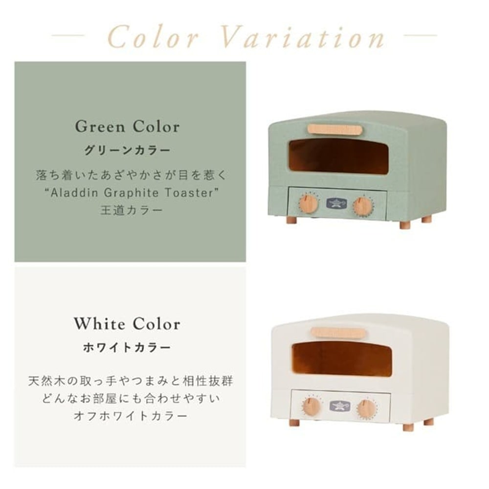 アラジン グラファイトトースターに ホップルが魔法をかけたら、 ミニサイズのたのしいトイになりました。 トースターで大変有名な「アラジン グラファイトトースター」とのコラボ商品が誕生! 細部まで再現されたトースタートイは、まるで本物のよう。 パパやママの真似をして遊べます。 子どもの想像力を育む知育玩具にピッタリでおままごと遊びがもっと楽しくなります。 オーブンの扉には見えないマグネットが付いているのでスムーズに開閉できます。 本体の窓にはオレンジ色と透明のアクル板が付いてきます。オレンジ色のアクリル板を付けると本当に焼いているかのような見た目に。 カチカチ音が鳴る2つのつまみは、くるくる回して遊べます。 背面には焼き印でランプマークのロゴ入りです。 インテリアにも馴染むクラシカルなデザインは、遊ばなくなっても小物収納となるのでリビングや玄関、キッチンにぴったりです。 大人気のコロコロシリーズと一緒に使うと、更に遊びの幅が広がります。
