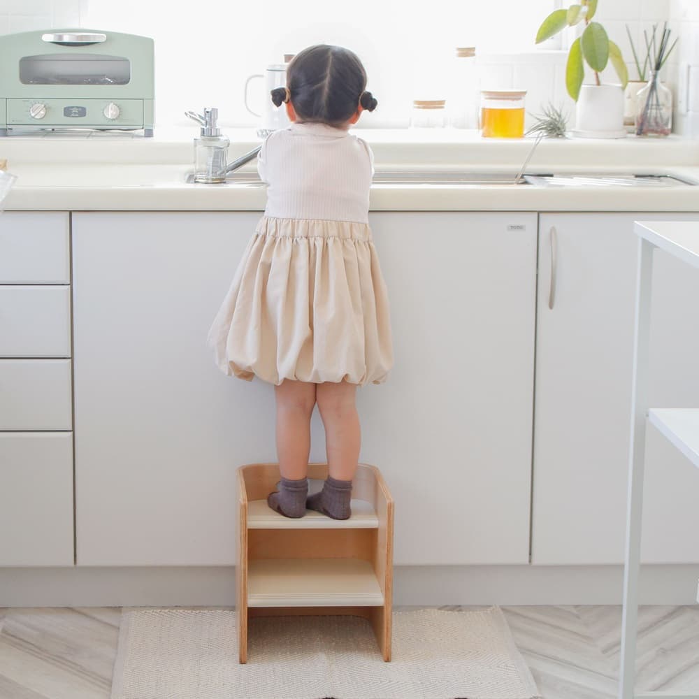 自分でできた!をひとつずつ増やしていくための手助けをする小さな相棒。 踏み台が必要ない時もチェアとしていつでも一緒。 これひとつで子ども用の椅子・大人用の椅子・踏み台の役割を持つため、家具は最小限に抑えたいご家庭にもピッタリ。 転がして向きを変えるだけでどの向きでも踏み台として使え、チェアとしてもご利用いただけます。 足を掛けた際に、滑らないように30mmごと計3本の溝を加工。また、控えめな角丸加工で転倒しにくい仕様に。耐荷重は60kg(最大100kg) 幼稚園~小学校低学年程のお子さまを持つ家庭で高確率で使われている踏み台は、あると便利な育児アイテム。手洗いや歯磨き・トイレトレーニング・キッチンでのお手伝いなどで活躍し、お子様の自立を促します。 落ち着いたデザインでどんなインテリアにも自然に馴染みます。