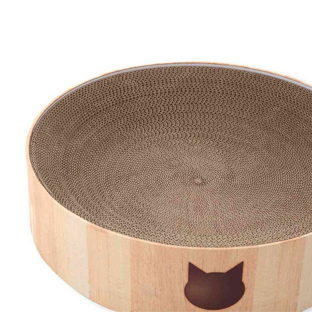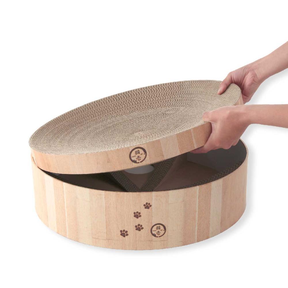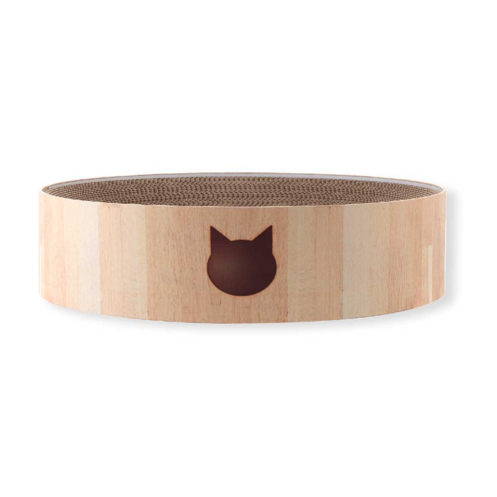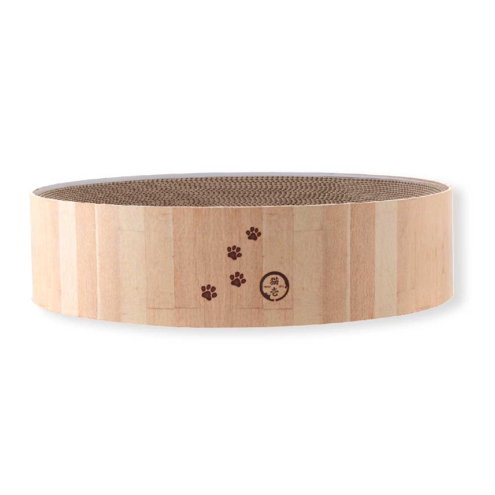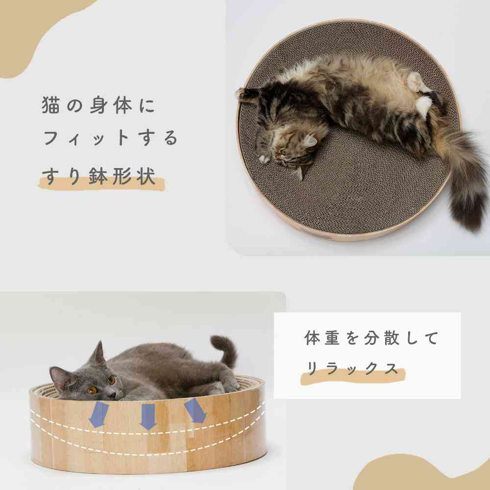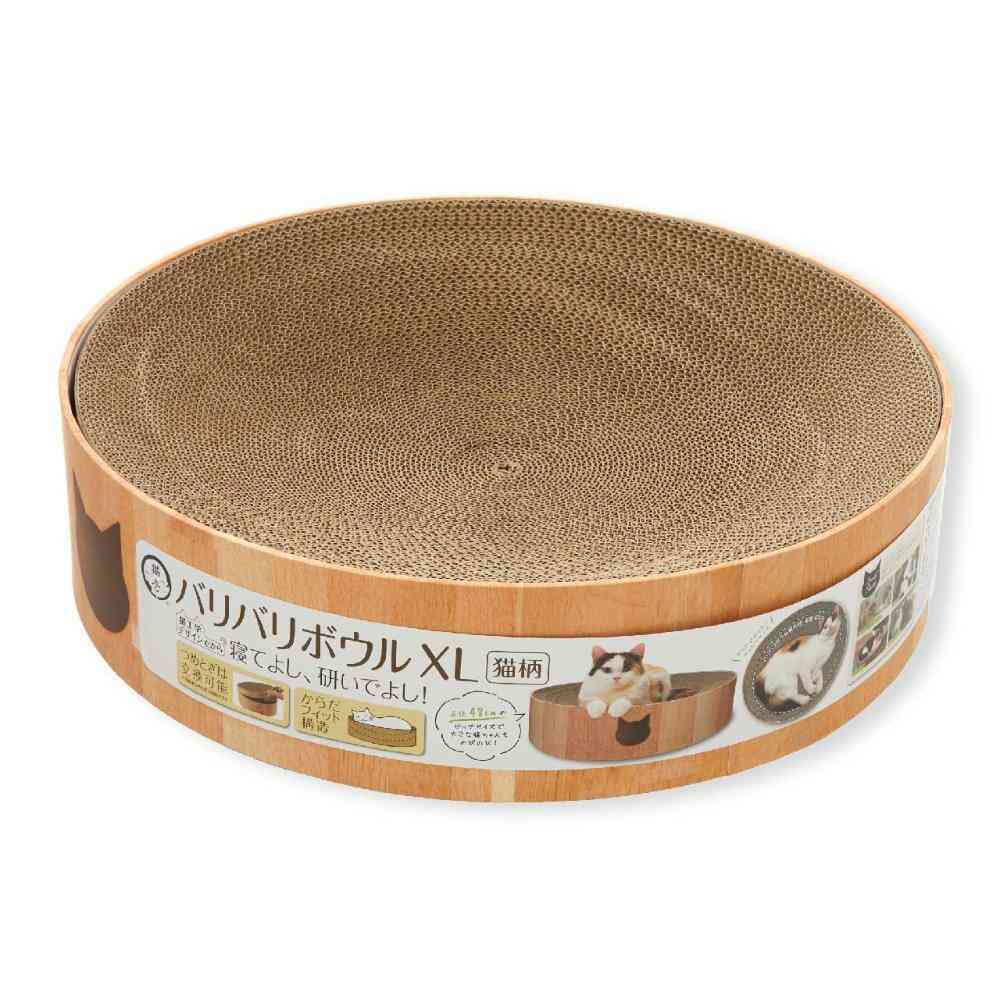 ■"直径48cm"XLサイズ 猫壱の大人気「バリバリボウル」から待望のXLサイズが登場です!通常サイズ直径40cmから、大きくサイズアップした直径48cmのXLサイズ。体重6kg超えの大きな猫でものびのび使える嬉しいサイズです。高さは通常サイズと同じ12cm。高すぎない段差で、上り下りの負担もなく、お部屋に置いた時の圧迫感も軽減します。 ■からだフィット形状 つめとぎ兼ベッド部分はダンボール製。重なりあった薄いダンボールが、土台に沿ってきれいなすり鉢状を作ります。猫のやわらかいからだにフィットするので、猫がリラックスできます。 ■つめとぎ部分は交換可能 バリバリボウルの特徴であるつめとぎ部分のみの交換可能です。交換用つめとぎ(別売り)。 猫のつめとぎは消耗品だからこそ、長く使っていいただけるよう、工夫しています。 ■あたたかな木目調シートデザイン 48m×48cmの大型サイズだからこそ、お家のインテリアを邪魔しないシンプルな木目調デザインとなっています。猫のフェイスマークと肉球の足跡入で可愛さもプラスしました。 ※外枠はダンボール板製です。木製ではございませんのでご注意ください。