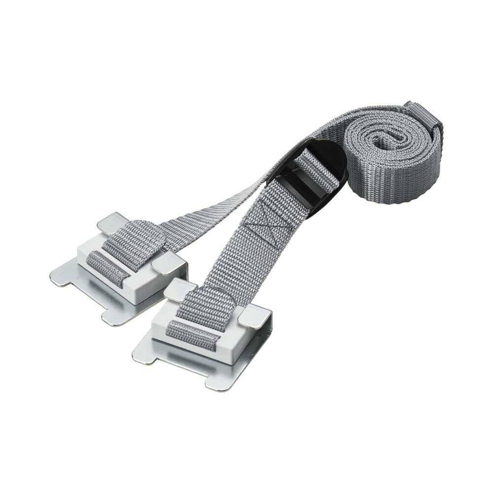 グラッと来る前に。収納物をしっかり固定! 取り付け可能幅:900~1,200mm 耐震度:震度6強相当 外寸:ロックホルダー:約52(W)×47.6(L)×16.2(D)mm、ベルト:幅25mm 【セット内容】:本体(ベルトフック付きベルト×1、接着パッド付きロックホルダー×2)、アルコールパッド×2、取扱説明書
