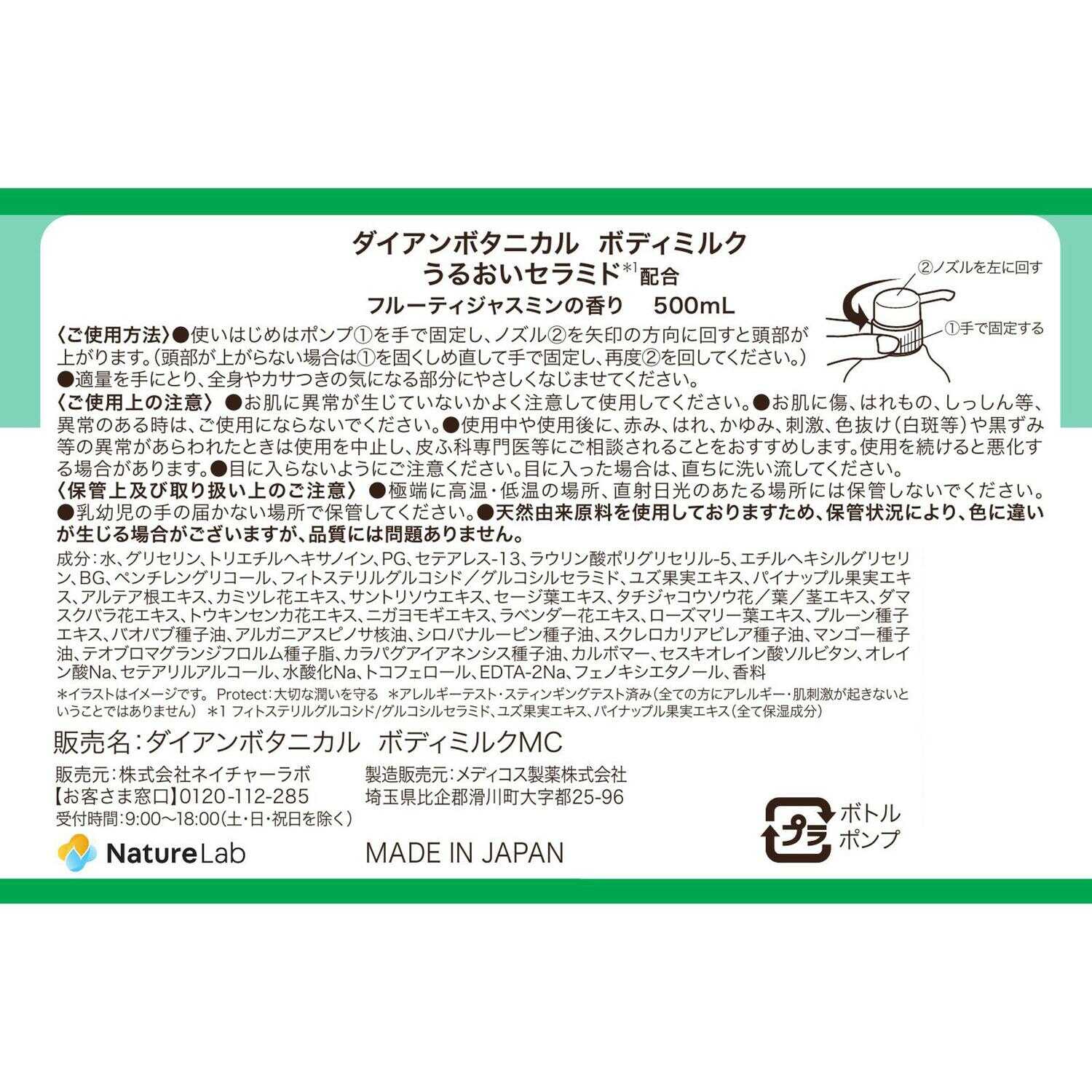 ●3種のボタニカルセラミド配合。90%以上天然由来成分配合のボディミルク。天然由来の保湿成分で肌のうるおいを守ります。 ●フルーティジャスミンの香り ●7つの無添加:サルフェート(ラウレス硫酸Naなど)・石油系界面活性剤・合成着色料・エタノール・鉱物油・パラベン・シリコン不使用