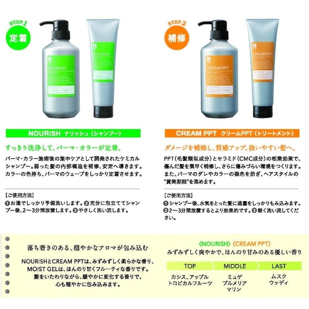 PPT(毛髪類似成分)とセラミド(CMC成分)の相乗効果で、傷んだ髪を素早く補修し、さらに傷みづらい環境をつくります。 また、パーマ・カラー直後の集中ケアに最適でパーマのダレやカラーの褪色を防ぎ、ヘアスタイルの「賞美期限」を高めます。 (使用方法)シャンプー後、水気をとった髪に適量をしっかりもみ込みます。2~3分間放置するとより効果的です。その後、軽く洗い流してください。