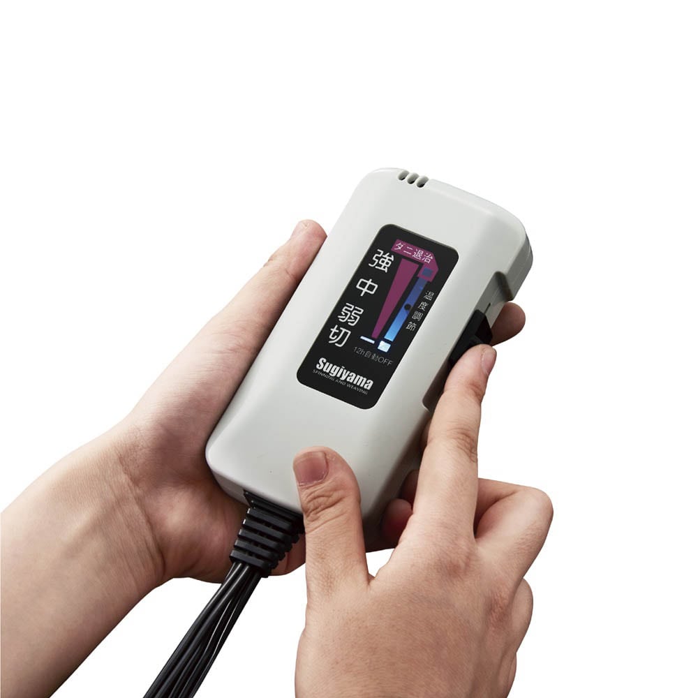 〇定番カラーの赤いチェック柄の電気ひざ掛けに新たな機能を追加。本体側のコードが従来品の2倍の長さに、便利に使えるホックボタン(2箇所)、コントローラーホルダー(付属)がついて、さらに使い易くなりました。〇切り忘れても安心、12時間後自動OFFタイマー付き。〇操作しやすいスライド式温度調節。(暗い部屋でも見やすいバックライト付き) 〇急に冷え込んでも快適、室温センサー内蔵。(室温が約23度以下になると、設定から自動で約3度温度アップ) 〇取扱説明書の記載手順に従いダニ退治ができます。 〇コントローラーを外して丸洗い可能。(洗濯ネットを使用して洗濯機でも洗えます。※ドラム式洗濯機、乾燥機はご使用できません。)●定格/交流100V-55W 50-60Hz共用 ●コード長/電源側 約1.9m、本体側 約1.2m ●表面温度/強:約52度 、中:約36度、弱:約23度 ●電気代(1時間あたり)/強:約1.0円、中:約0.6円、弱:約0.2円(1kWh当たり31円で算出)●重量/約0.8kg ●保証期間/お買上げ日より1年