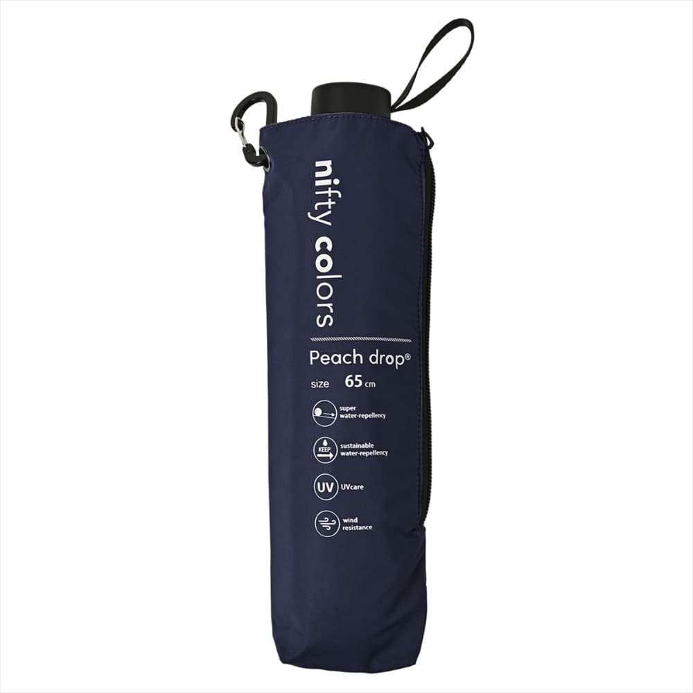 大きめ親骨65cmサイズの風に強く丈夫なオールラウンドの「Peach drop(ピーチドロップ)」は、超はっ水と耐風仕様の折りたたみ傘です。 「Peach drop」は、水滴を弾く桃の皮(ピーチスキン)のように、生地の表面が微起毛になった雨が当たっても一瞬で水滴を弾く超はっ水素材です。 「超はっ水」とは一般的に「水滴が面に対しておおよそ150°前後の接触角で接する現象」と言われています。 「Peach drop」は接触角153°を測定し、生地の持つはっ水力で水滴が玉のような表面張力を保ちます。 加えて、はっ水性能の持続性が高いのも特徴です。 親骨には柔軟性があって丈夫な太めのグラスファイバーを使用し、風を受けてもしなやかに受け流します。 8本骨構造で、大きめな65cmサイズなのでしっかり雨風を防いでくれます(風速12m/sの検査済み)。 指や爪をはさみにくい「安全ろくろ(ストッパー)」を使用しているので、ボタン部分を押して開閉でき安心してお使いいただけます。 紫外線遮蔽率:99.8%になります。
